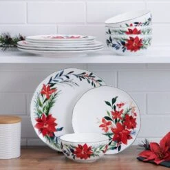 MIKASA Merry Poinsettia 12 Piece Dinnerware Set, Service For 4