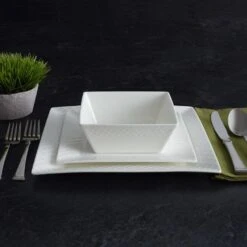 MIKASA Trellis White Square 16 Piece Dinnerware Set, Service For 4