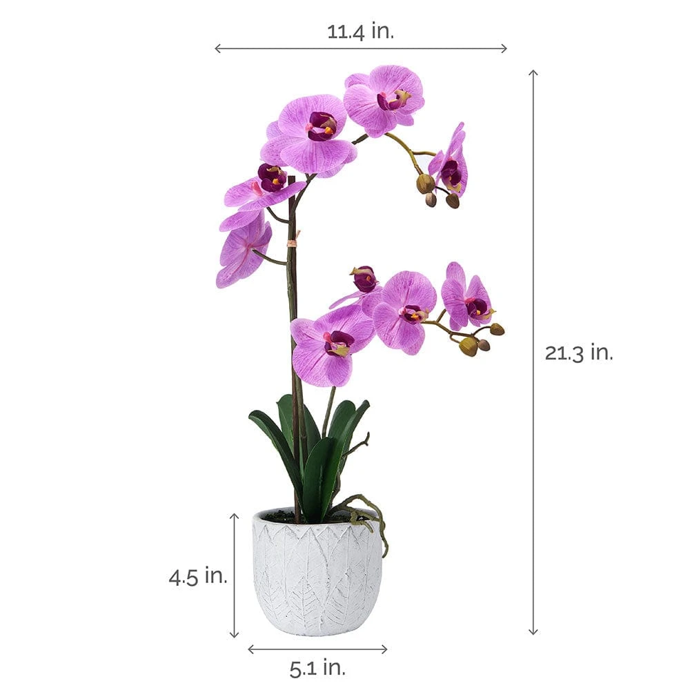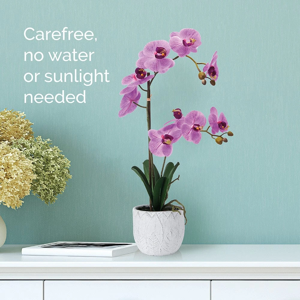 This Orchid Artificial Greenery by Mikasa is a charming display piece that features lifelike orchids in a decorative pot. Made from high-quality plastic materials, these flowers will amaze your guests with their lifelike touch and feel. Artificial florals are the perfect, low-maintenance solution to bringing the beauty of fresh flowers into your home — no sunlight or watering required. Realistic faux flowers create a relaxing, welcoming atmosphere and brighten any office, bedroom, bathroom, kitchen, balcony, living room, apartment, café, or classroom. These elegant decorations also make a great gift. Stems feature a hidden wire for bending orchids into a unique shape. FLOWER & POT SIZE: Flower measures 11.42×6.69×21.26; pot measures 5.125×4.5 inches.