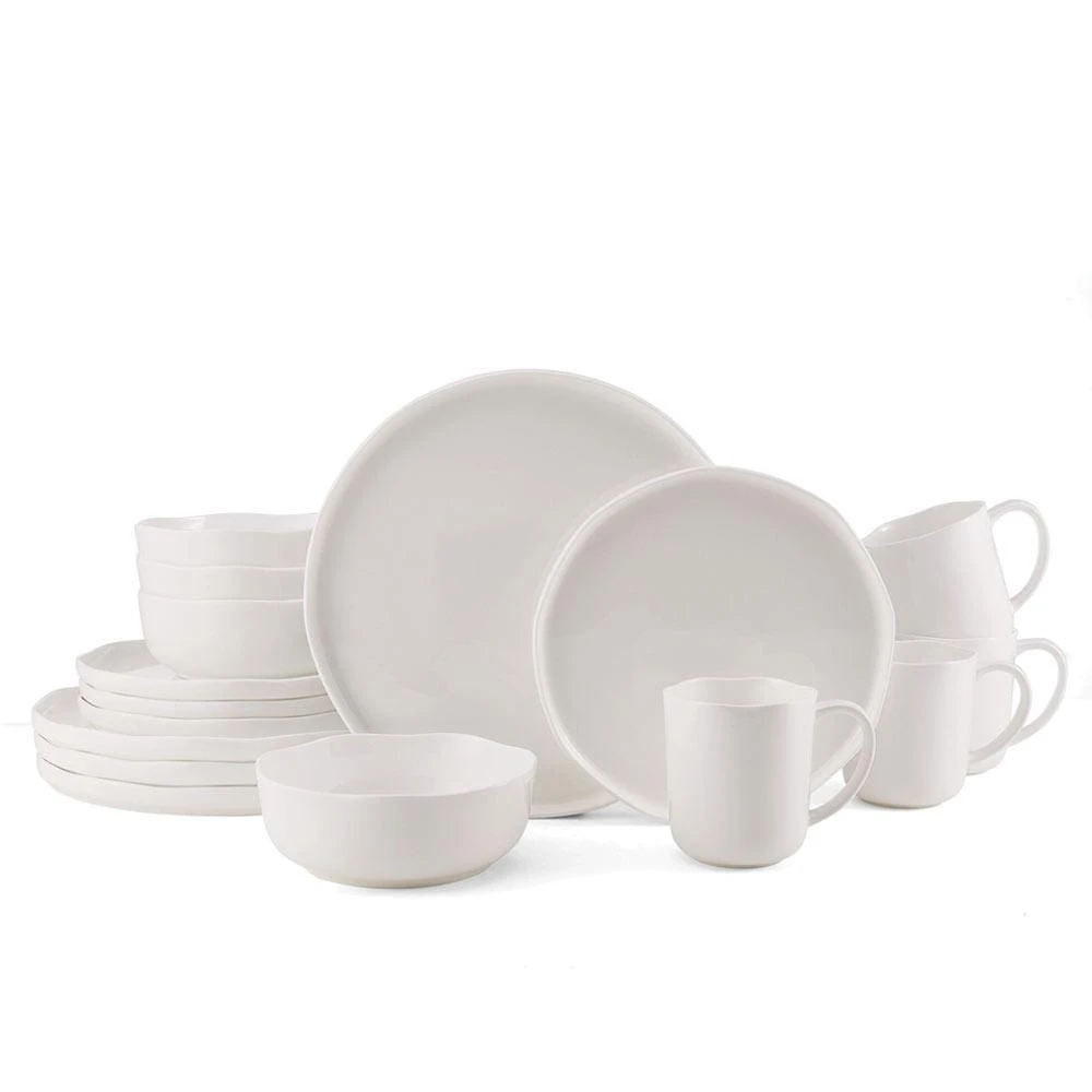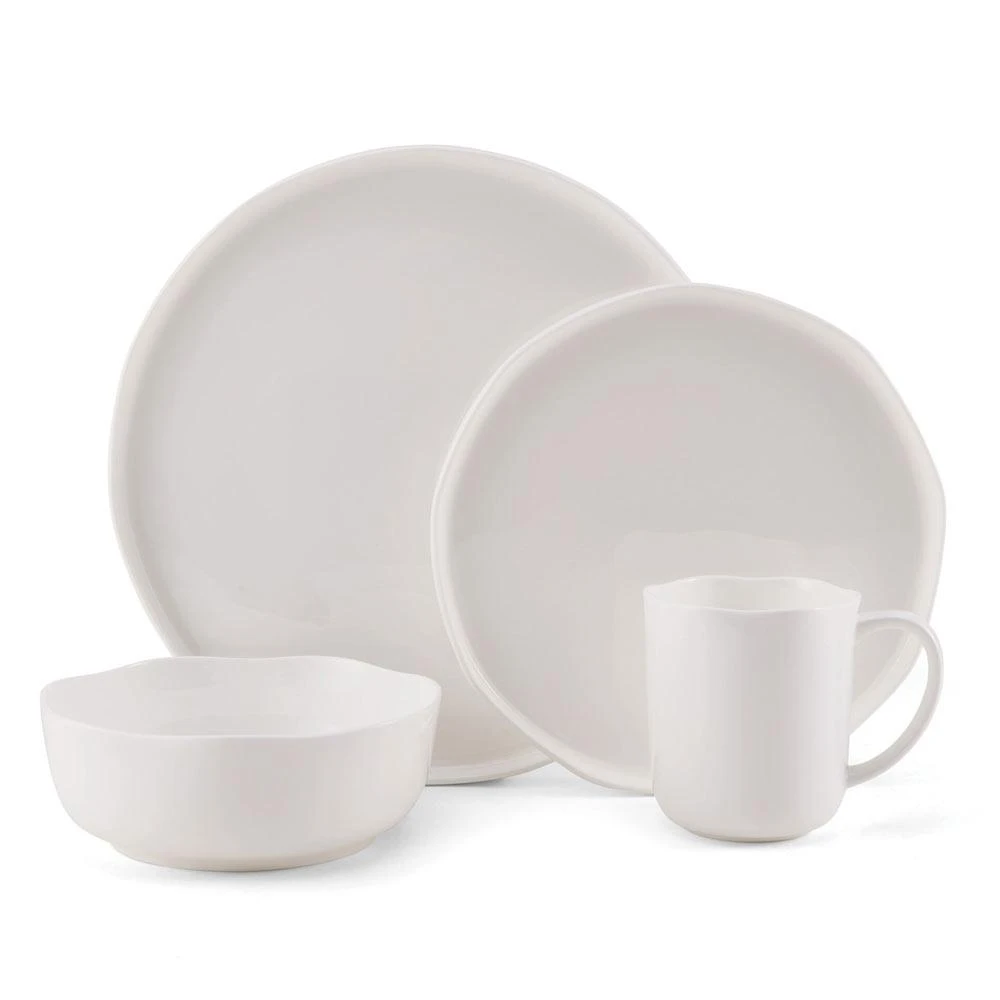 This Mikasa Adelaide Dinnerware Set features a distinctly modern twist. Round pieces are given a contemporary, organic design element, with uniquely curved rim edges and plates with raised sides. Crafted of bone china. 16 piece dinnerware set, service for four, includes (4) each: 10-1/2 inch dinner plate, 8-1/4 inch salad plate, 5-3/4 inch bowl, and 14 ounce mug. Microwave and dishwasher safe.