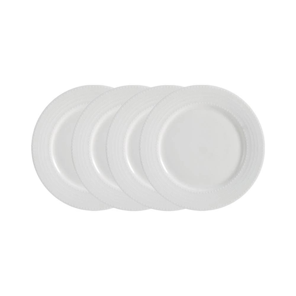 Bring stylish sophistication to any gathering with Annabel Dinnerware by Mikasa. White bone china in timeless shapes features delicate, hobnob detailing around each piece, giving your place settings a touch of classic design. Microwave and dishwasher safe. Set of 4 salad plates, each measures 9 inch diameter.