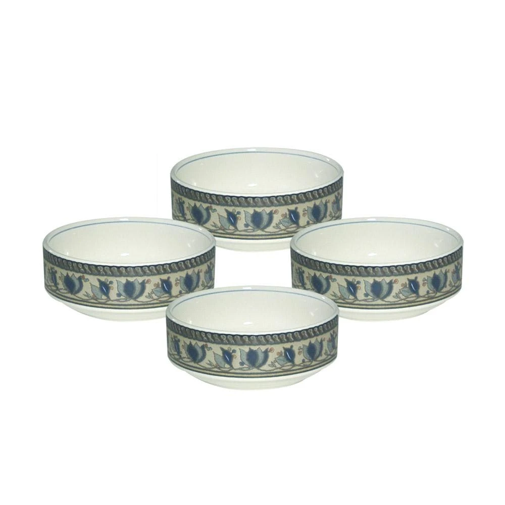 This elegant casual stoneware dinnerware has been a favorite since its introduction in 1986. The bold stylized navy blue tulips and vines on a rustic background flow around each of the pieces. Add the creamer and sugar, oval covered casserole, or any of the accessory pieces to expand your elegantly casual table. And once the dinner is over, all the pieces can go in the dishwasher for easy clean up. The pattern is also oven safe, microwave save and freezer safe. Set of 4 fruit bowls, each measures 5 inch diameter and holds 15 ounces.
