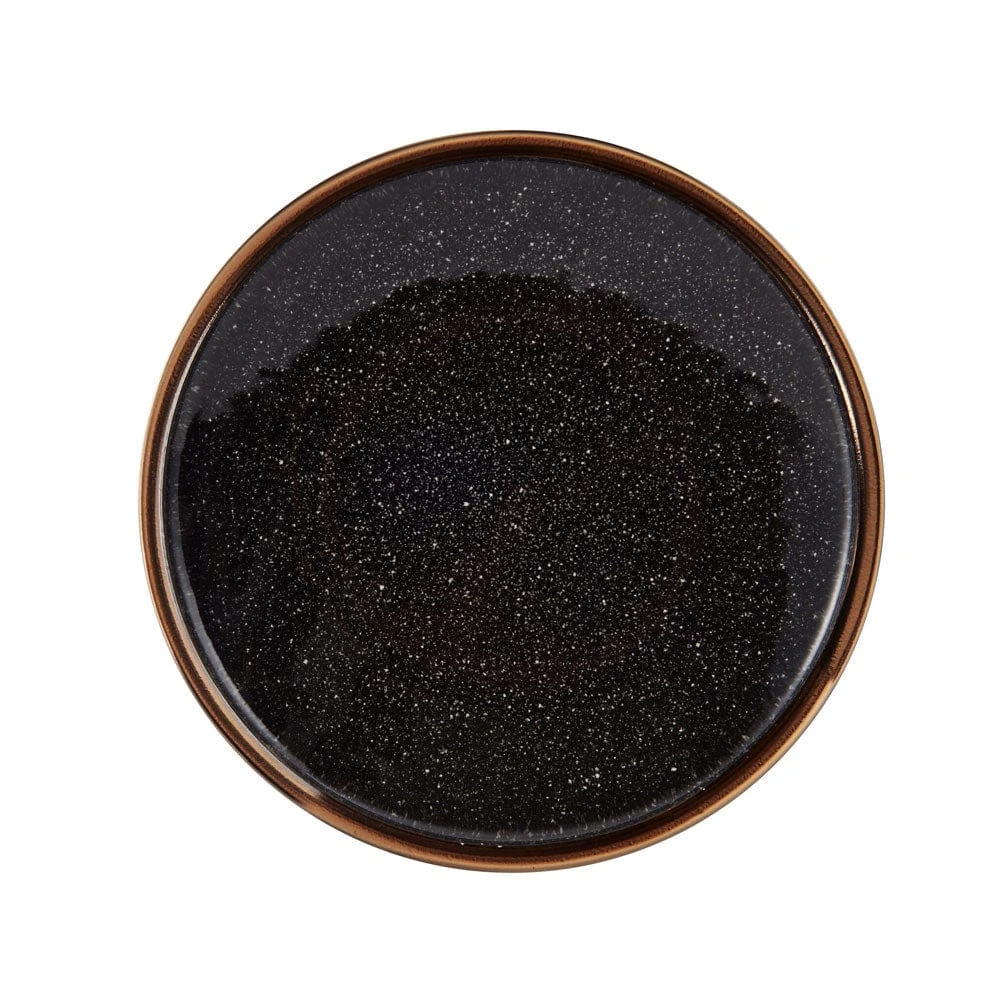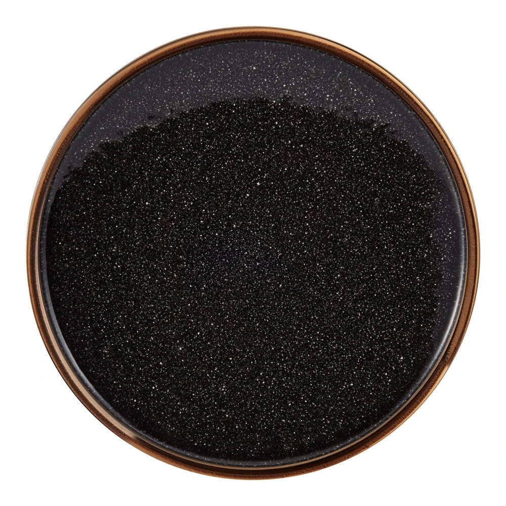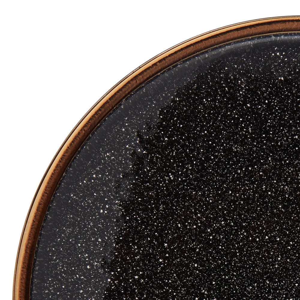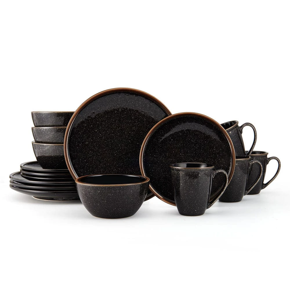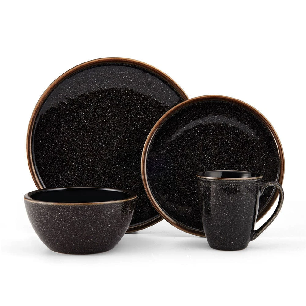 This Mikasa Barrett Black Dinnerware Set features a black speckle pattern that dazzles with a glossy finish and a thick metallic band around the edge, bringing a stunningly modern look to all your gatherings.