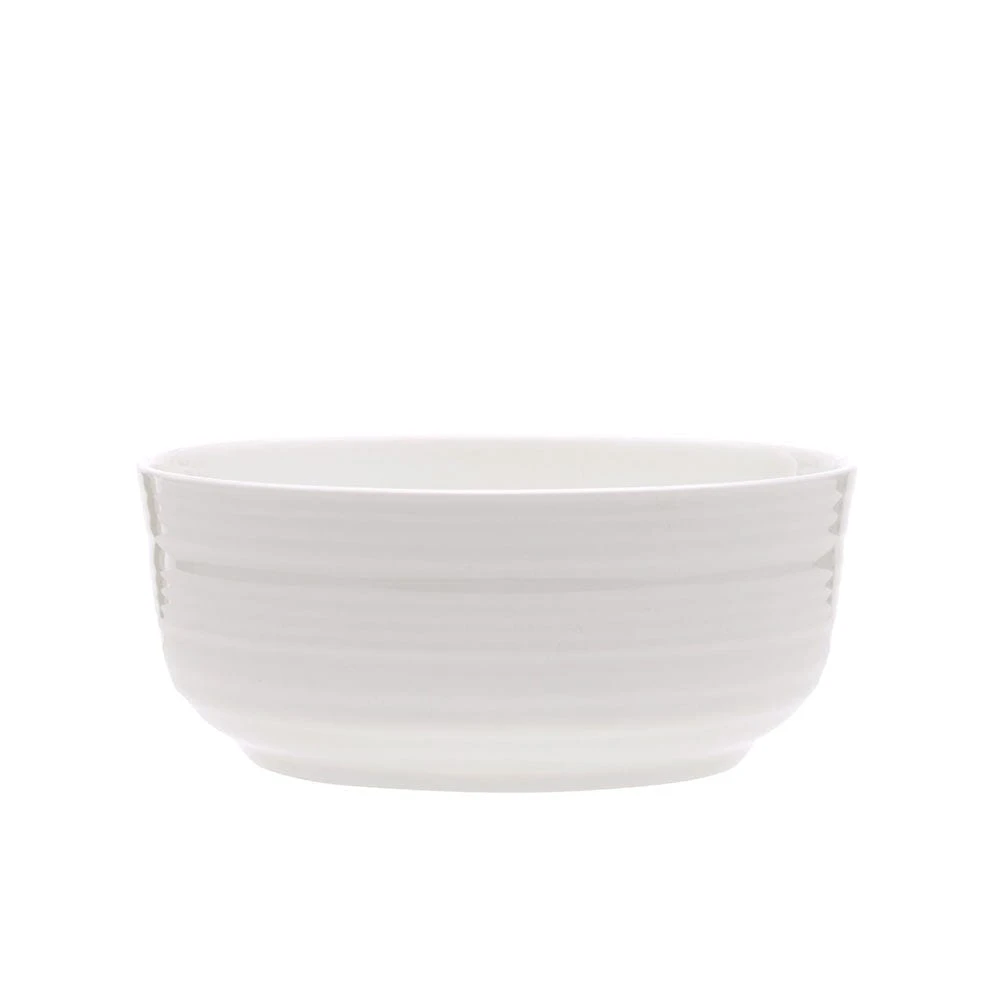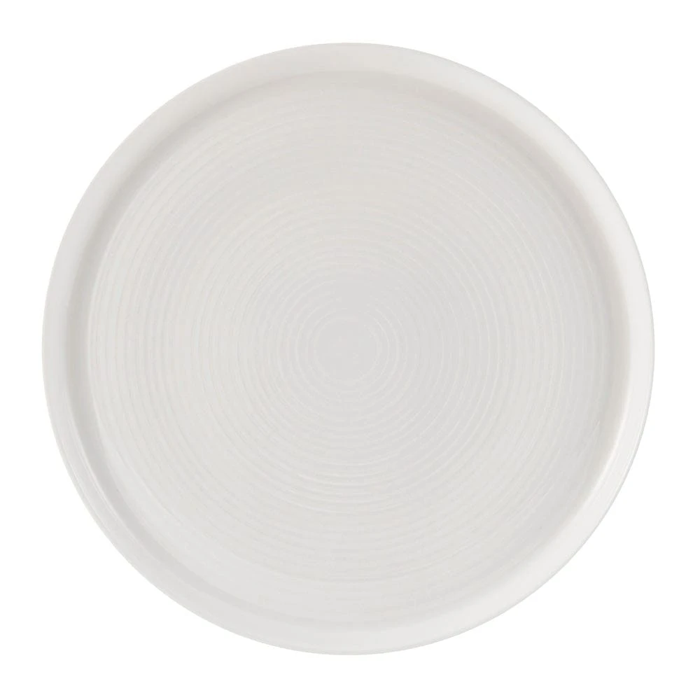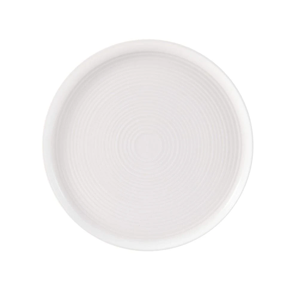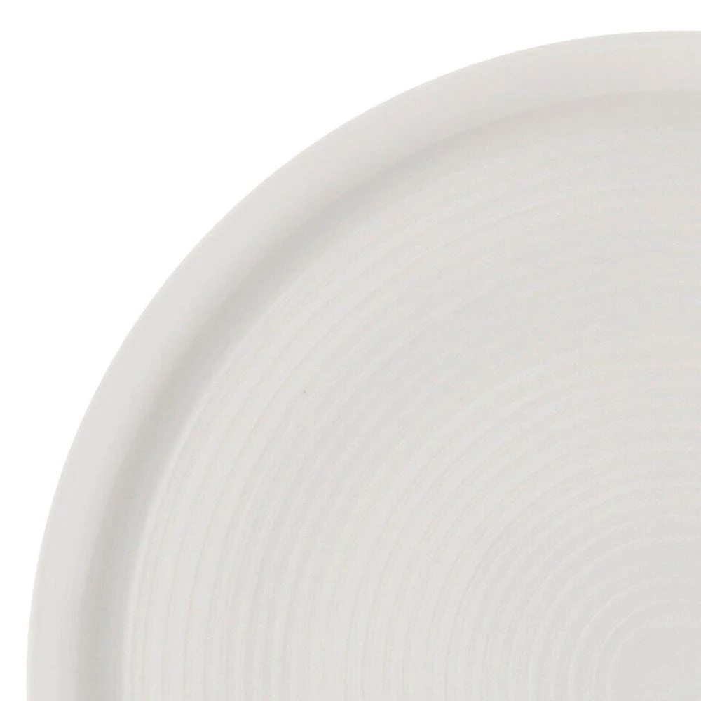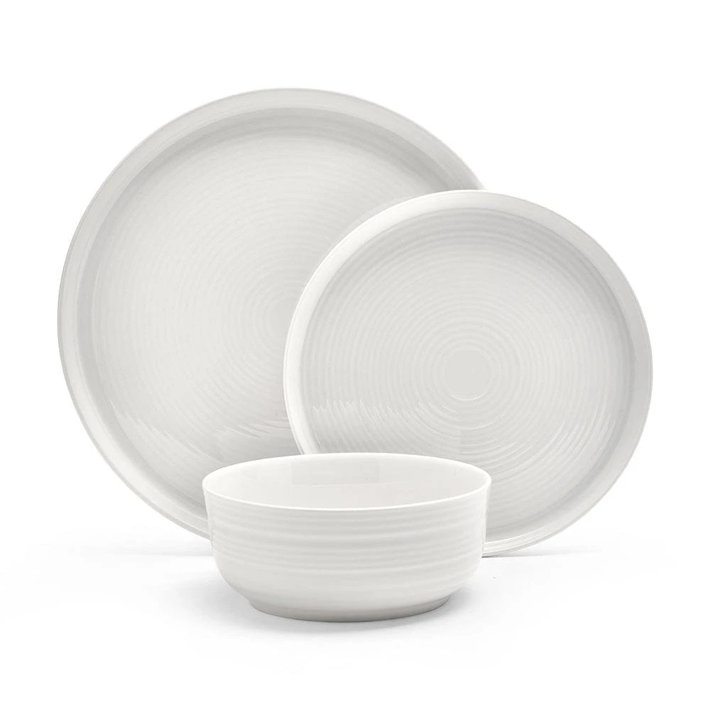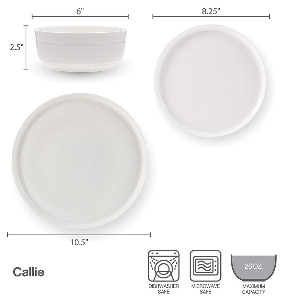 This Callie Dinnerware Set features a clean white design in modern shapes, and each piece is encircled by an embossed, striated line design with a distinct raised edge, adding a contemporary and stylish touch to your table.