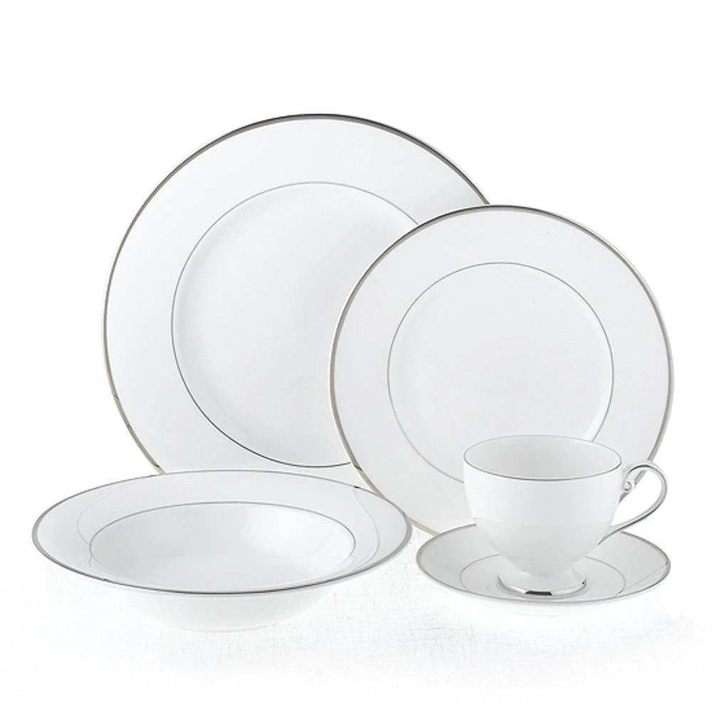 Unrehearsed glamour. The elegant platinum trim easily sets a luxurious stage for your dining pleasure … revealing a dramatic accent for that special setting. An elegant rim shape accented by a simple yet classic platinum band. Coordinates perfectly with formal stemware and flatware. Crafted of high quality porcelain. Dishwasher safe but not microwave safe. 5 piece place setting includes a 10-3/4 inch dinner plate, 8 1/2 inch salad plate, 8-3/4 inch rim soup bowl (14 ounce), 9 ounce tea cup and 6 inch saucer.