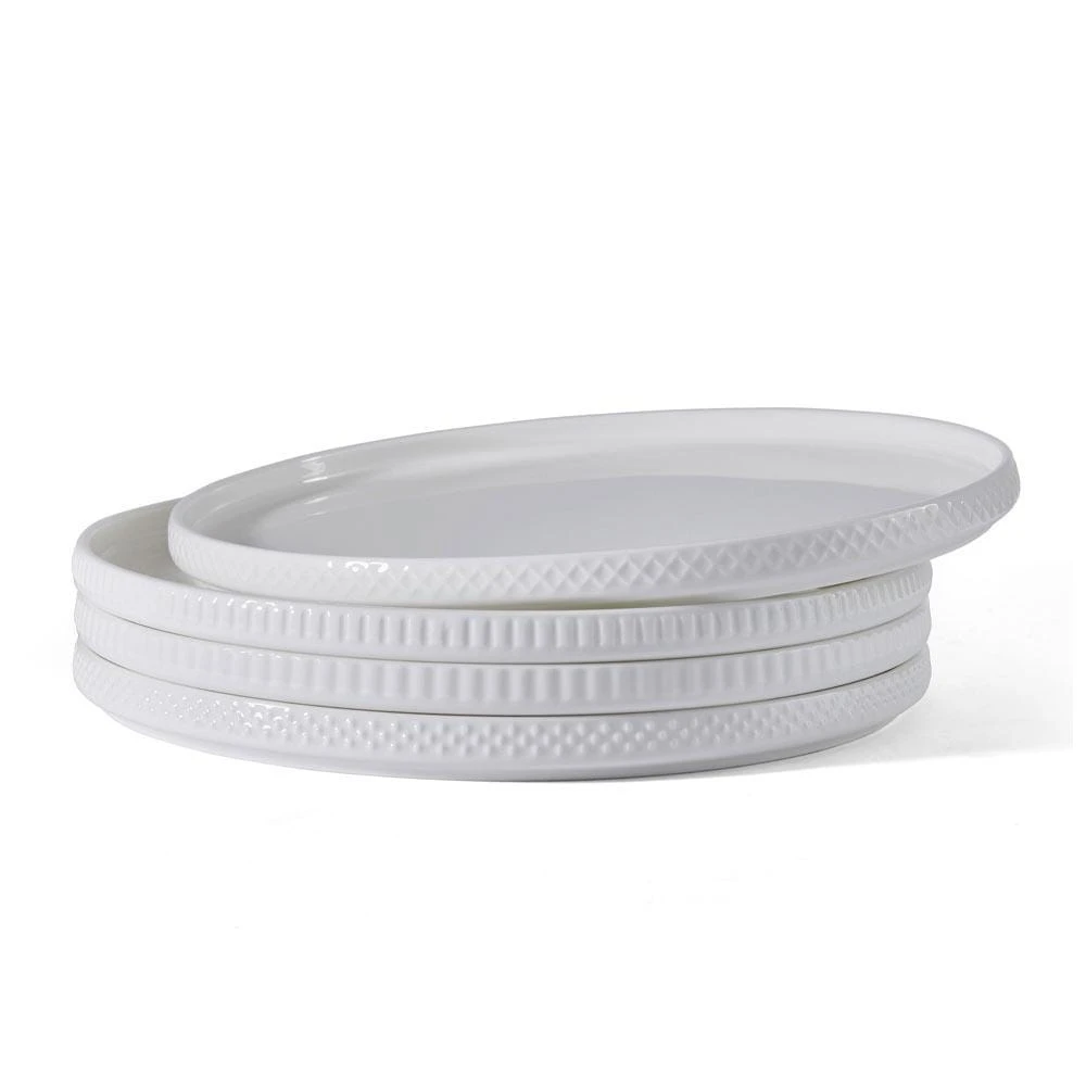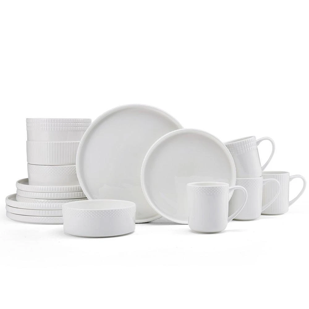 Camila Dinnerware features basic white pieces with a variety of subtle, embossed designs around the rims in circle, line, rectangle, and diamond shapes. Crafted of durable, chip-resistant, high-quality bone china. 16 piece dinnerware set, service for four, includes (4) each: 10 inch dinner plate, 8 inch salad plate, 6 inch diameter x 2-1/2 inch high (26-3/4 ounce) cereal bowl and 15-1/2 ounce mug. Microwave, dishwasher, freezer, and oven safe.