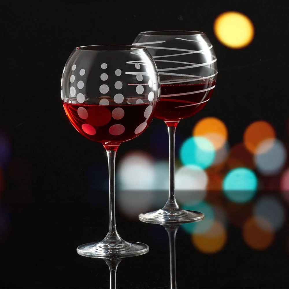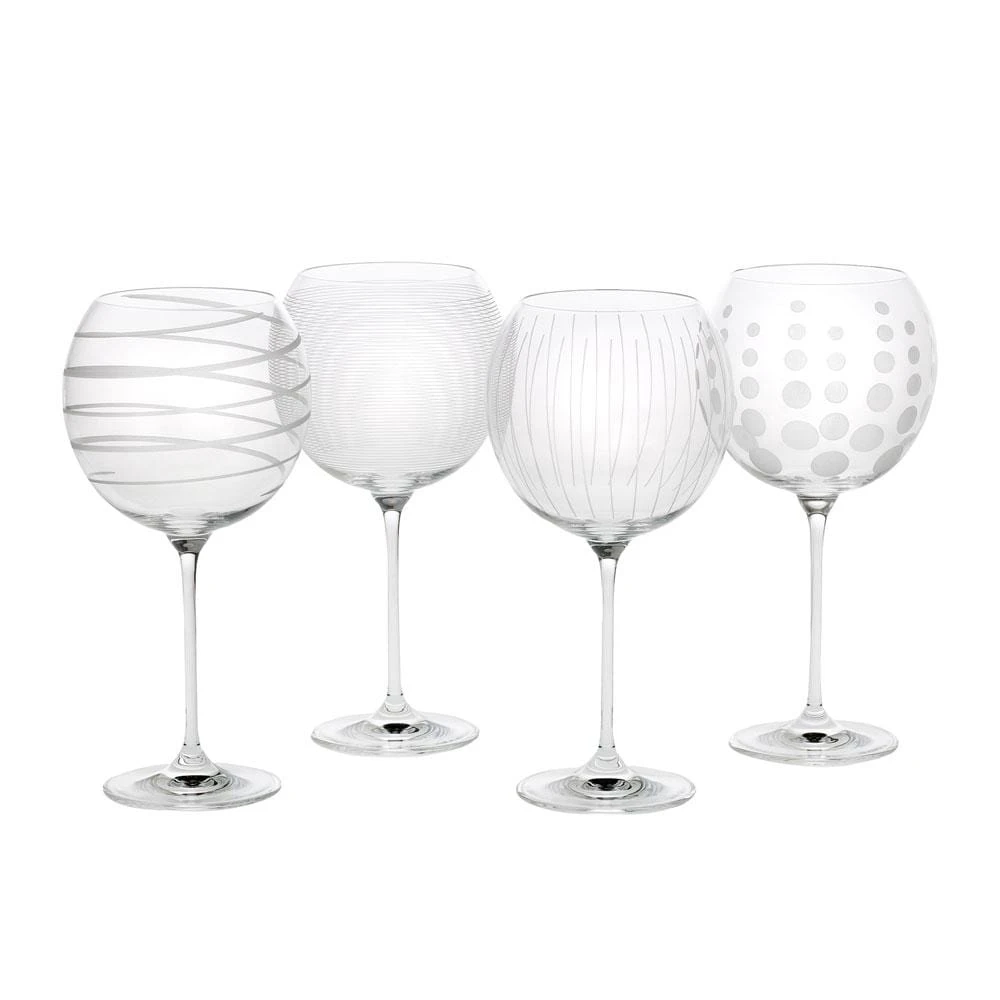 The fun and whimsical designs of the Cheers collection set a festive mood at any gathering. Each glass in the set of 4 is precision-etched with a different yet coordinating design. The dots, lines, and swirls are also distinctive, so each of your guests can easily identify their glass. Dishwasher safe, each holds 24-1/2 ounces.
