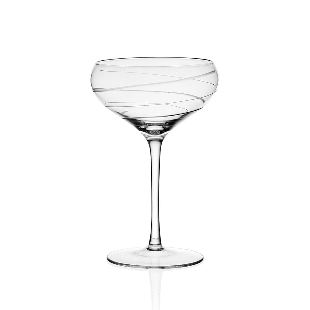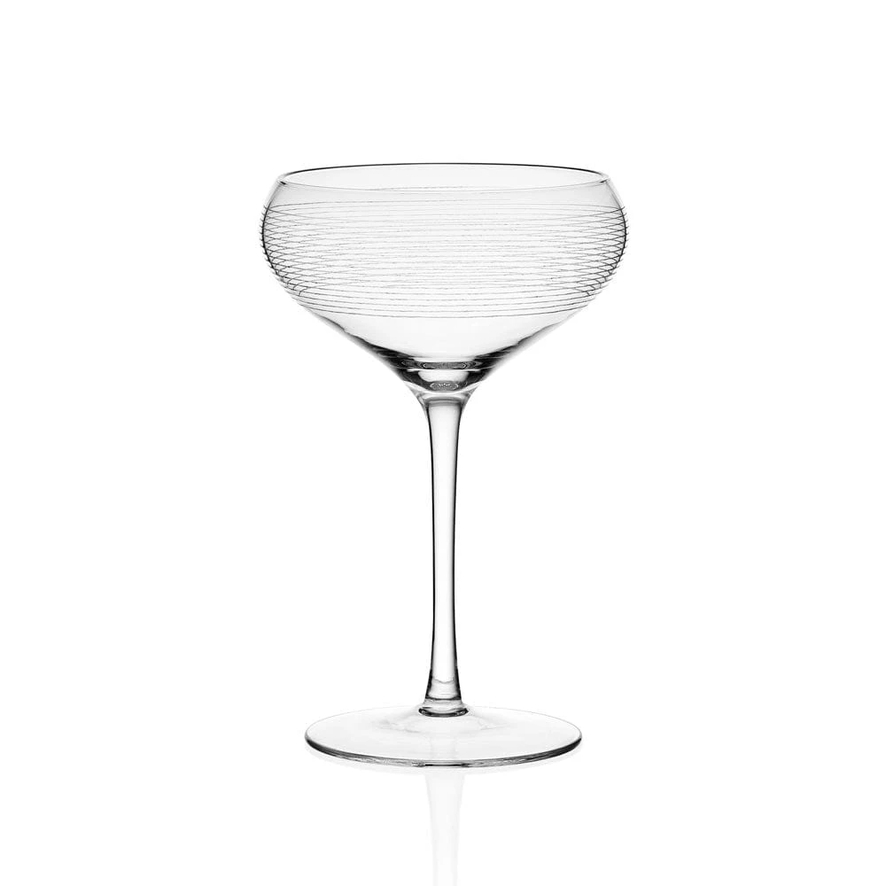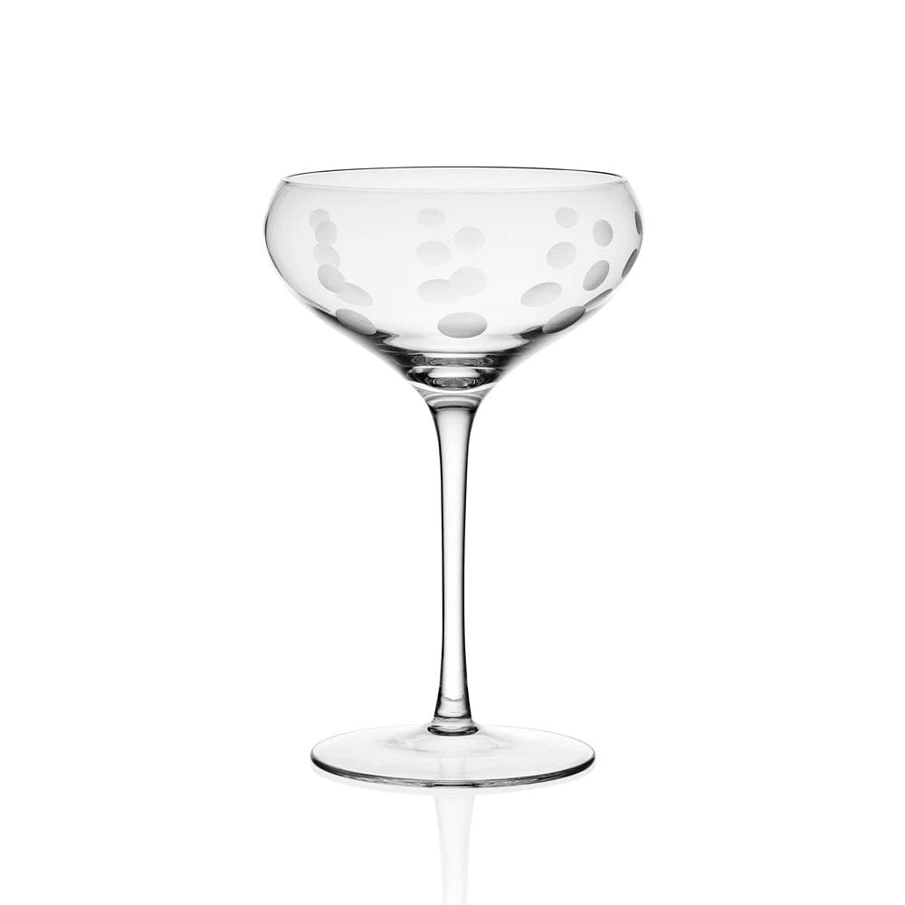 The fun and whimsical designs of the Cheers collection set a festive mood at any gathering. Contemporary coupe cocktail glasses elevate any drink with a unique, curved shape and slim stem. Each glass features a distinct pattern, including lines, swirls, and dots, so each of your guests can easily identify their glass.