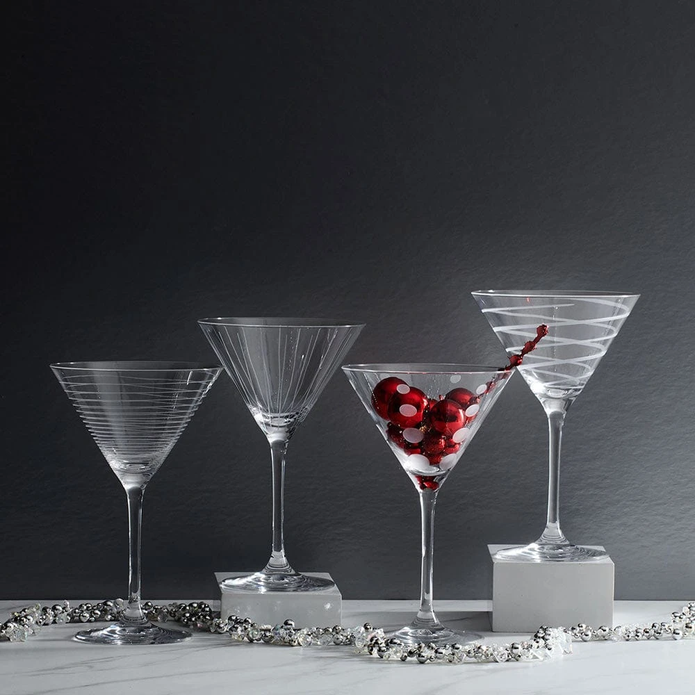 The fun and whimsical designs of the Cheers collection set a festive mood at any gathering. Each glass in the set of 4 is precision-etched with a different yet coordinating design. The dots, lines, and swirls are also distinctive, so each of your guests can easily identify their glass without the need for wine charms. You can also expand your collection with even more designs from the perfectly coordinating Cheers Too collection. Dishwasher safe. Set of 4 martini glasses, each measures 7-1/2 inch high and holds 10 ounces.