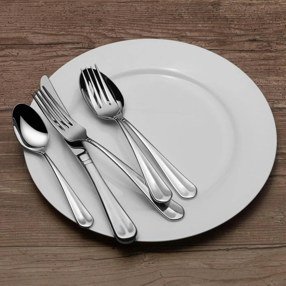 Mikasa Colette Flatware provides timeless style and a contemporary twist, making it perfect for everyday dining and casual gatherings. Features classic teardrop handles with a double dip design that creates a vertical line accent down the middle, and is enhanced by the lustrous mirror finish. Crafted of superior quality 18/10 stainless steel. 45 piece flatware set, service for eight, includes (8) each: dinner fork, salad fork, dinner knife, dinner spoon, and teaspoon, plus (1) each: serving spoon, pierced serving spoon, cold meat fork, sugar spoon, and butter knife. Dishwasher safe.