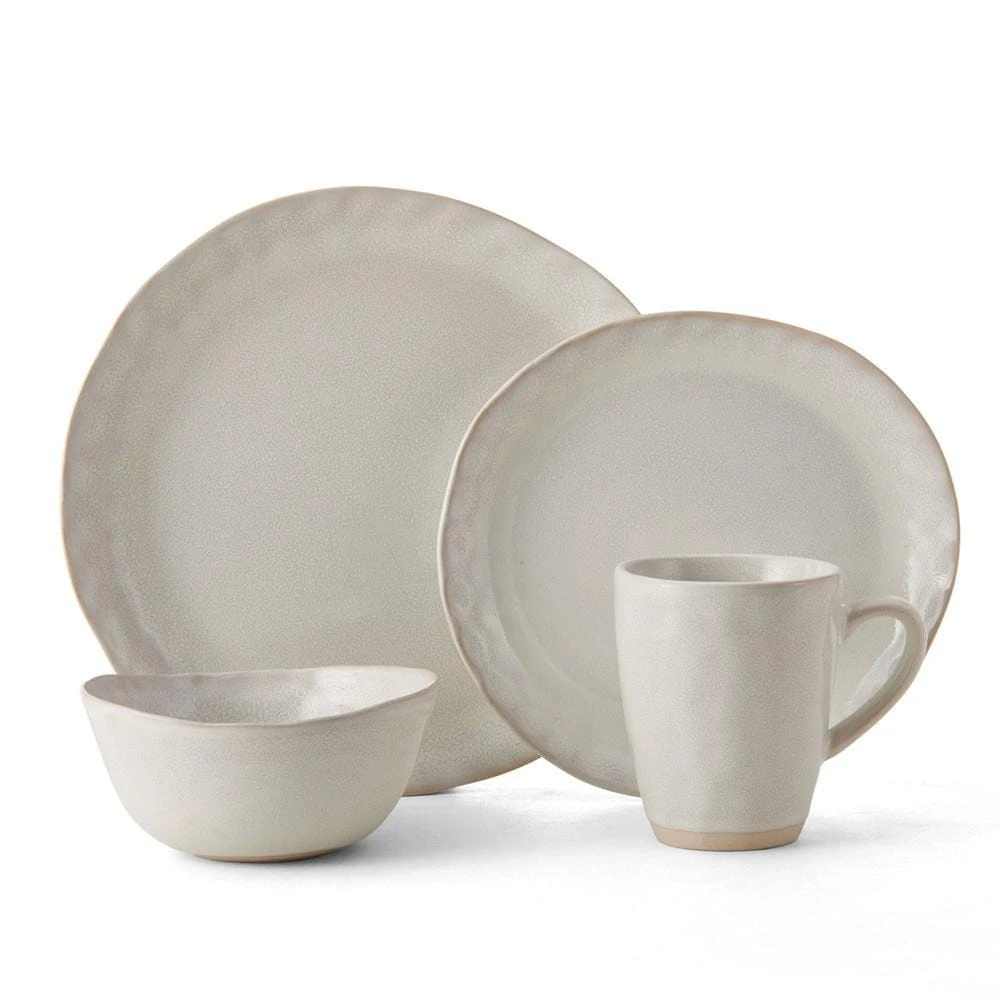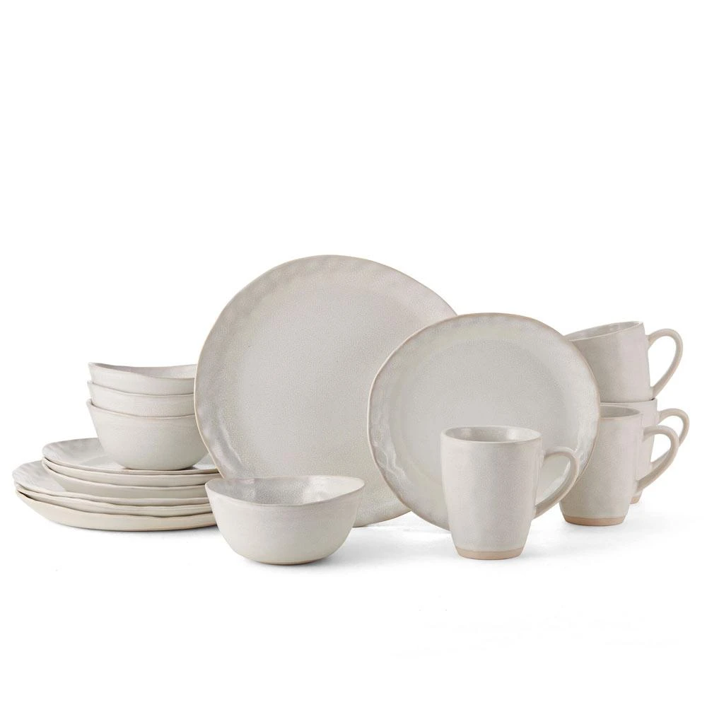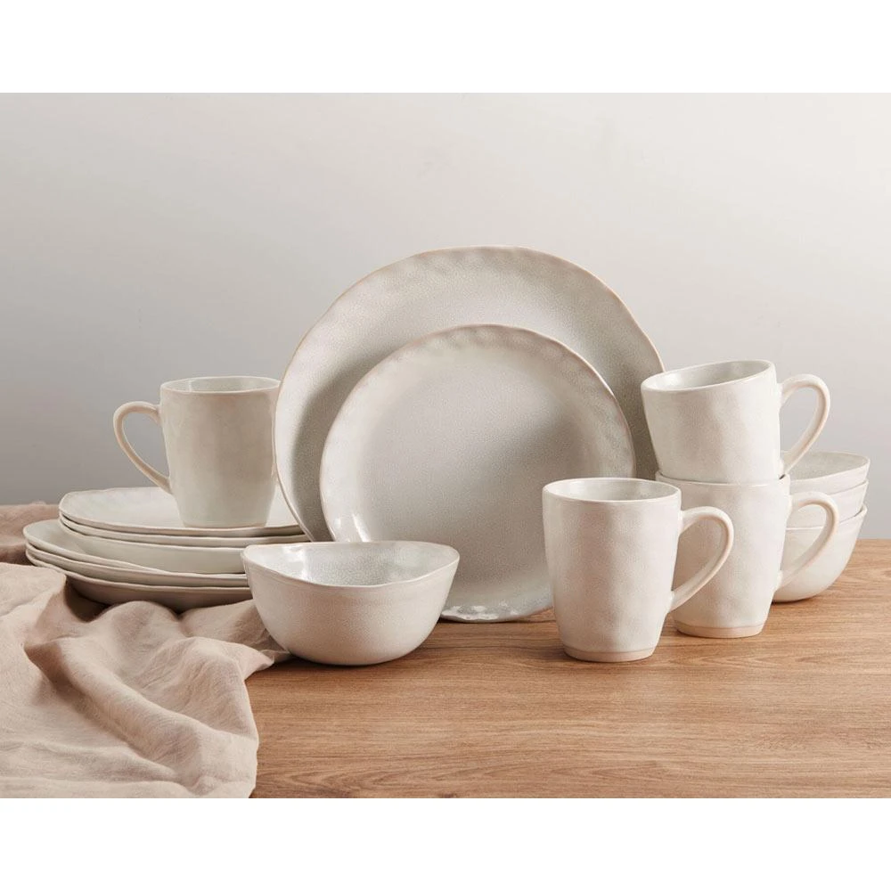 This Mikasa Cora White Dinnerware Set features organic, coupe-shaped pieces in an earthy white, with a warm, sandy accent color around the rims, and have a natural sense of movement that will add an element of modern intrigue to your table setting. Crafted of stoneware, featuring a reactive glaze. Due to the nature and hand-crafted qualities of reactive glaze, no two pieces are exactly alike and will exhibit unique variations in color and pattern. Product may slightly differ from image show. 16 piece dinnerware set, service for four, includes (4) each: 11 inch dinner plate, 9 inch salad plate, 6 inch diameter (16 ounce) bowl and 12 ounce mug. Microwave and dishwasher safe.