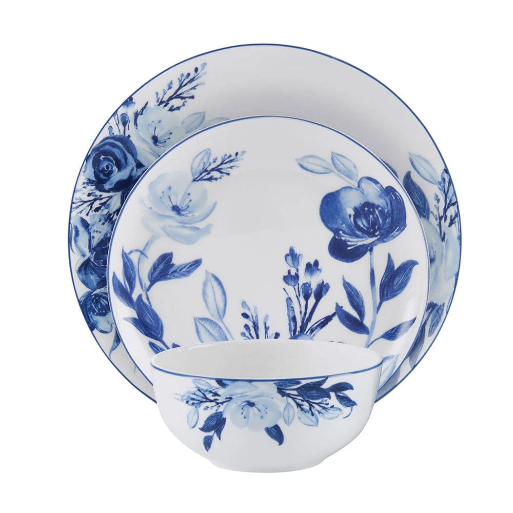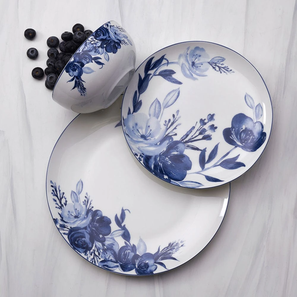 This Darcy Dinnerware Set is adorned with a vivid blue floral pattern that dances across the surface of each piece, with a thin blue line framing the edge of the rims, highlighting the design and making the dinnerware pop on your tabletop.