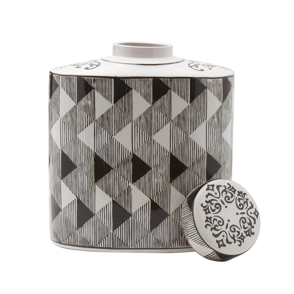 This Black and White Diamond Canister by Mikasa features a bold design that brings a modern look to any room. Use this functional decor piece to store small household items or showcase faux flowers, or display the canister alone as a stunning accent piece. Place on desks, dressers, or any other tabletop piece of furniture. Makes a great gift. Measures 9 inch L x 5 inch W x 10-1/2 inch H. Not food safe. Decorative only.