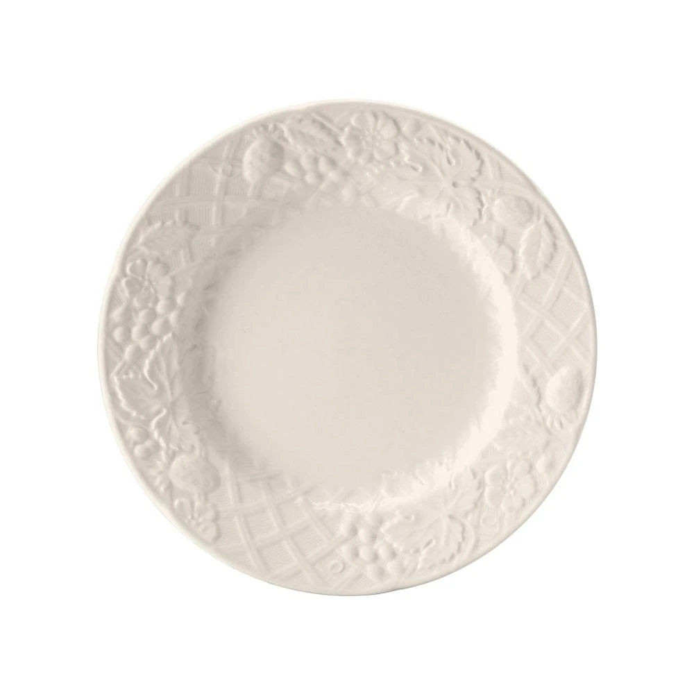 The essence of nature is transformed into a sophisticated setting with the simplicity and style of this charming all-white embossed fruit design. Whether formal and casual, English Countryside adds a touch of class to your dining pleasure. One of our best selling patterns, there is a full array of accessories for a beautiful and complete casual dining statement. Crafted of stoneware. Microwave and dishwasher safe. This salad plate has an 8-1/4 inch diameter.