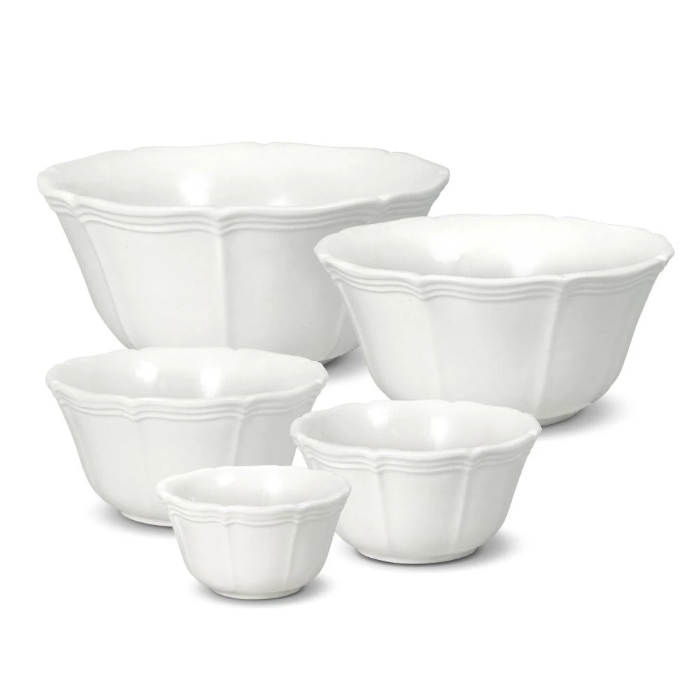 Gently scalloped edges and curves on these generous sized pieces add grace every time you set the table. Its rich cream color makes French Countryside a perfect base pattern to mix with colorful accent pieces. A best selling pattern, a complete suite of accessories is available to create a classically stylish casual dining statement. Expertly crafted from earthenware. Microwave and dishwasher safe. This set of 5 stacking bowls come in a variety of sizes for a variety of tasks. From mixing up a batch of chocolate-nut cookies to serving holiday vegetables and even storing leftover chestnut stuffing. Set of 5 stacking bowls includes (1) each: 4 inch diameter x 2-1/4 inch high (8 ounce), 5 inch diameter x 2-3/4 inch high (14 ounce), 6 inch diameter x 3 inch high (26 ounce), 7-1/2 inch diameter x 3-1/2 inch high (40 ounce) and 8-1/2 inch diameter x 3-3/4 inch high (60 ounce) bowls.