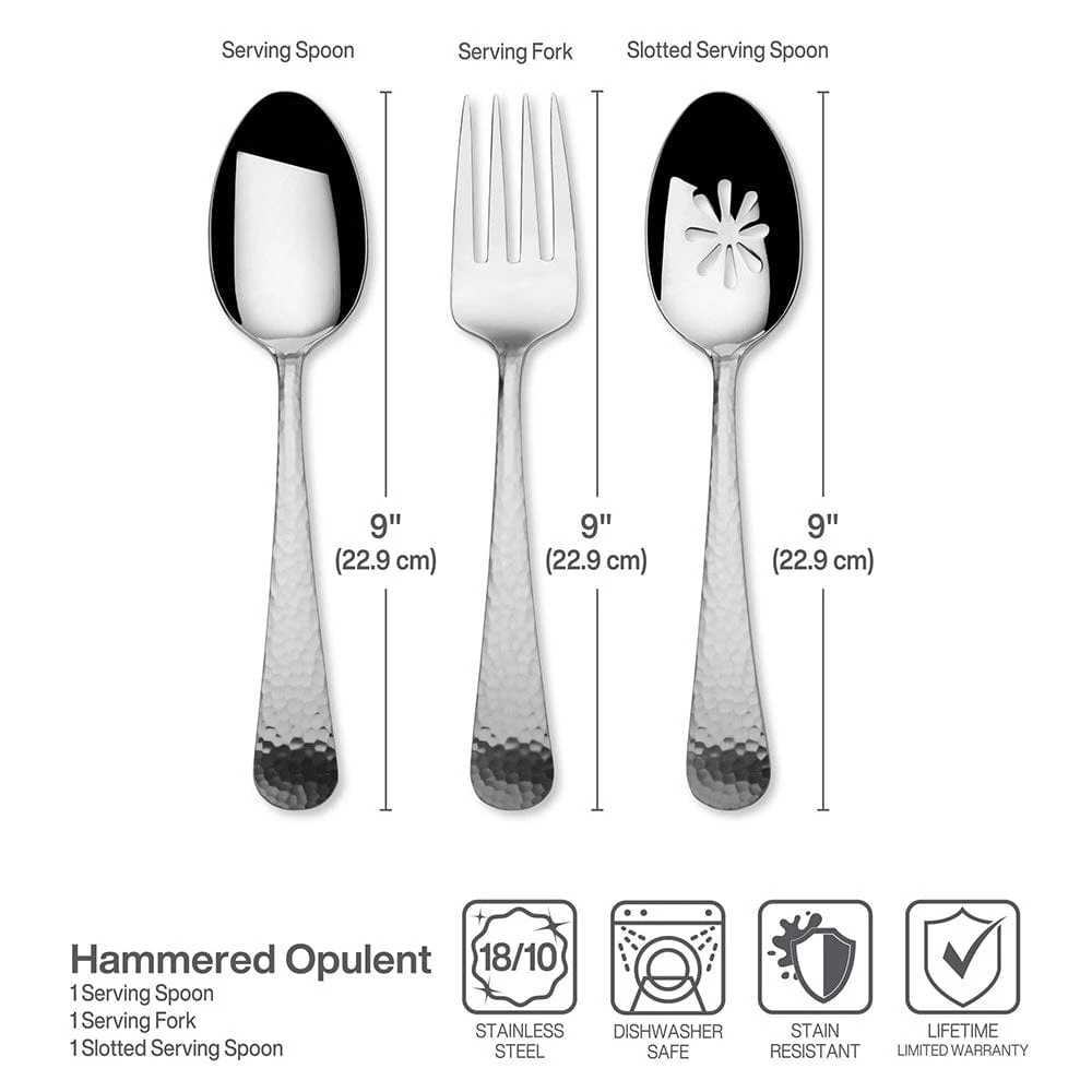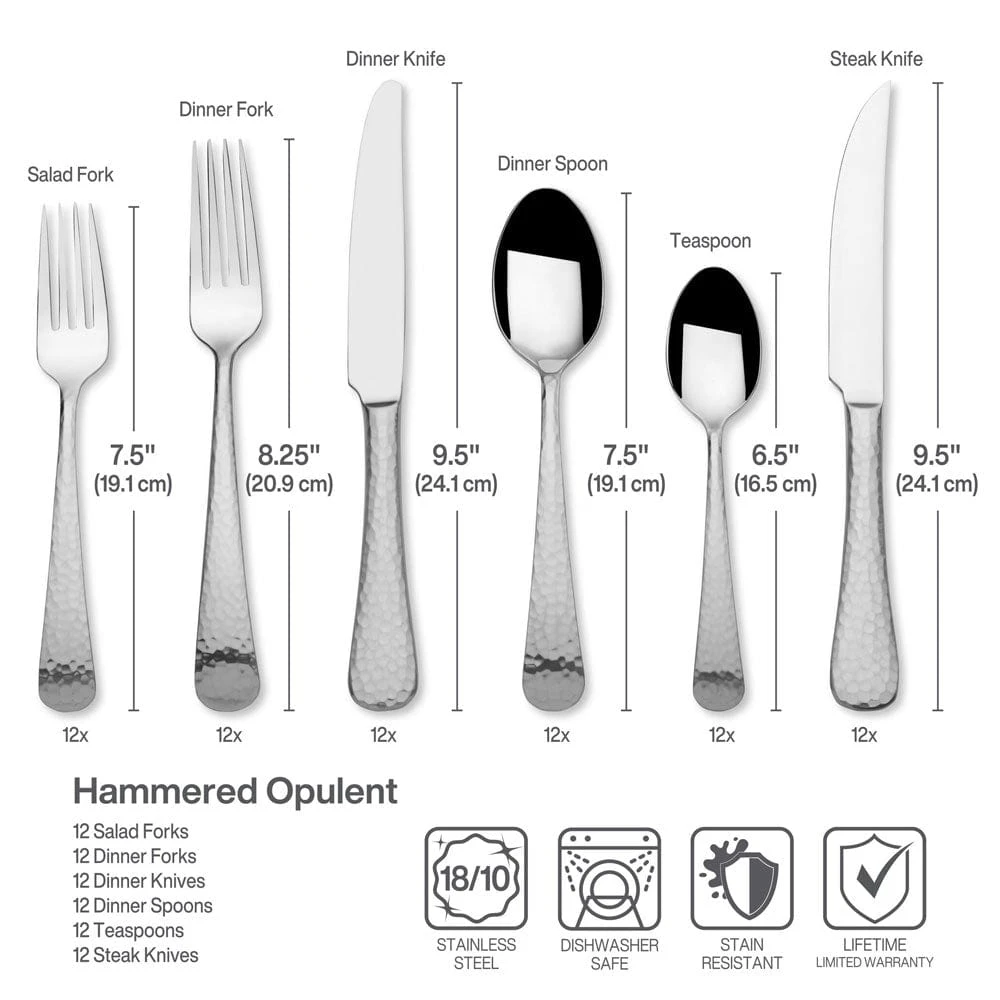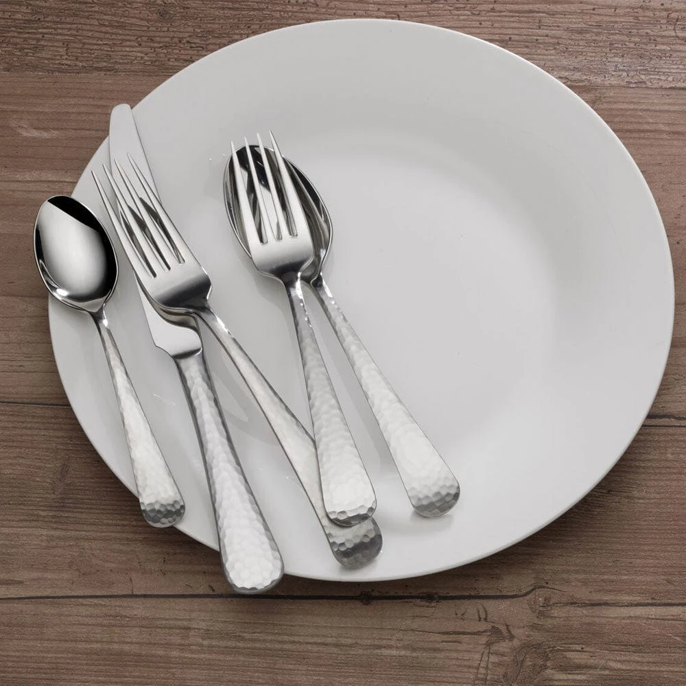 This Hammered Opulent Flatware Set features polished heads with a lustrous finish enhanced by the distinct hammered pattern on the handles. Adding to the unique look is an unexpected downward bend at the tips of the forks and spoons, and will bring an element of surprise to your formal or casual tabletop display.