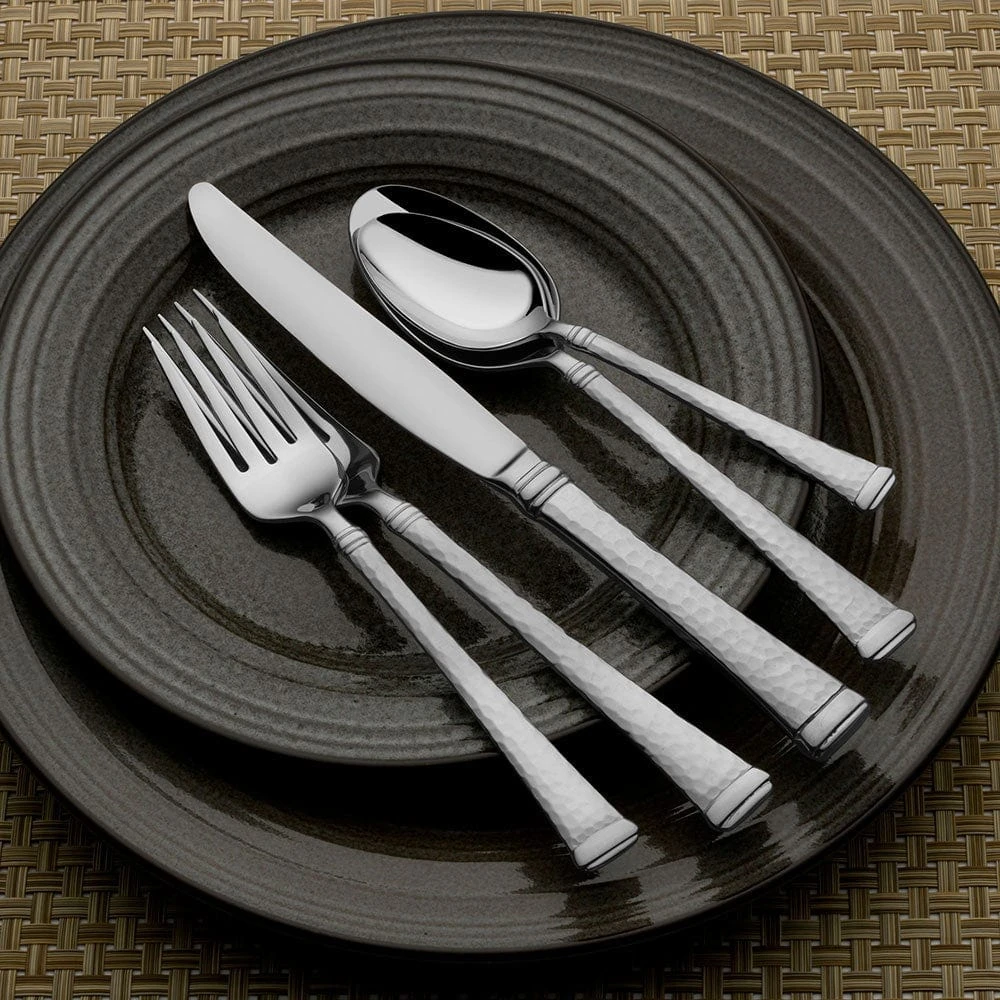 This Harmony Hammered Flatware Set features simple banding at the neck and base of the handle, with a unique hammered design that accentuates a timeless silhouette. A classic design that can be used for all occasions, whether a formal affair, or a casual dinner with friends and family.