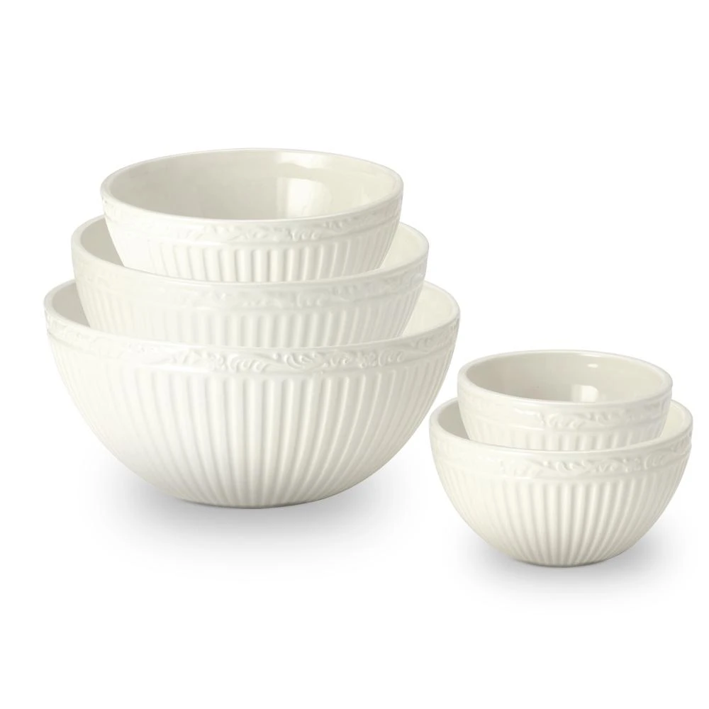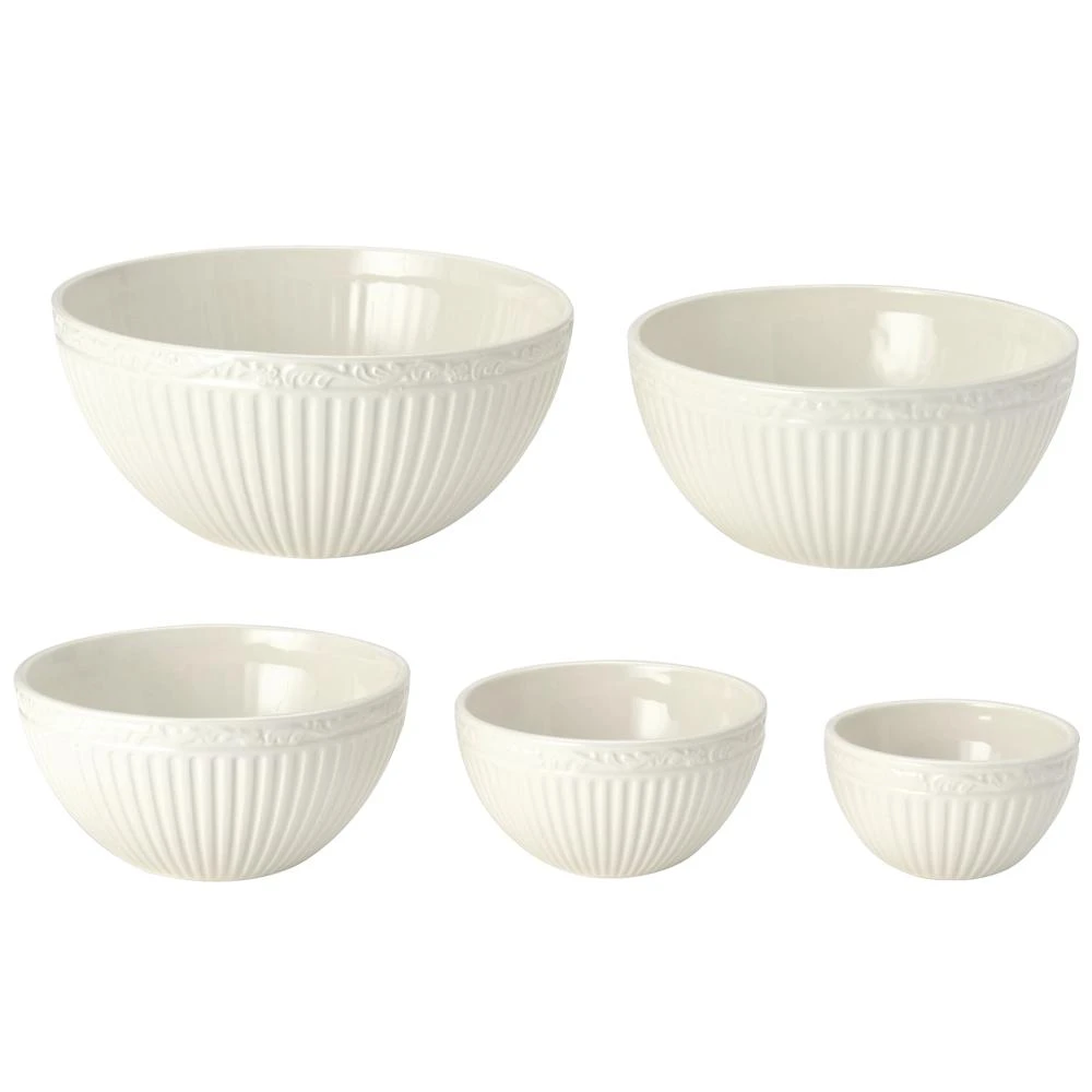 The fluted bands and column-like detailing of this dinnerware recall classical Italian architecture. A best selling pattern, a complete suite of accessories are available to create a classically stylish casual dining statement. Quality-crafted from stoneware, Italian Countryside is dishwasher and microwave safe. This set of 5 stacking bowls come in a variety of sizes for a variety of tasks. From mixing up a batch of chocolate-nut cookies to serving holiday vegetables and even storing leftover chestnut stuffing. Set of 5 stacking bowls includes (1) each: 4 inch diameter (9 ounce), 5-1/8 inch diameter (18 ounce), 6-1/4 inch diameter (19 ounce), 7-1/2 inch diameter (51-1/2 ounce) and 8-3/4 inch diameter (79-1/2 ounce) bowls.