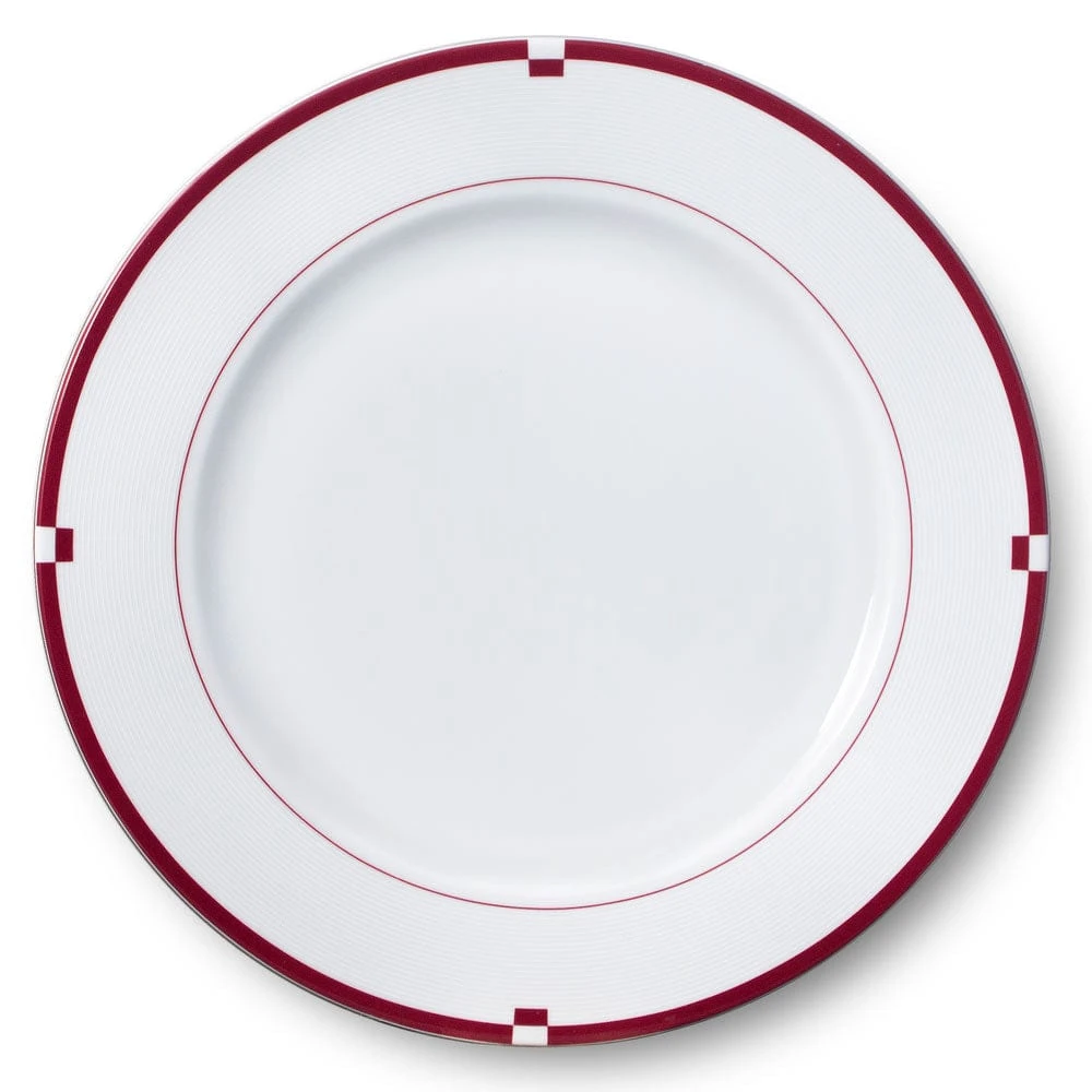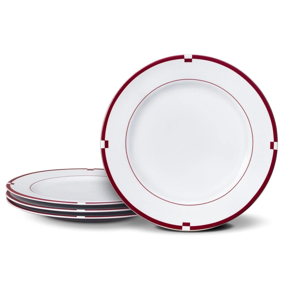 This Jet Set Red Set of 4 Dinner Plates feature a simple white background, the center is outlined with a thin red border, but it is the outer rim that captures the eye, with a subtle ridged element, framed by a thicker red band.