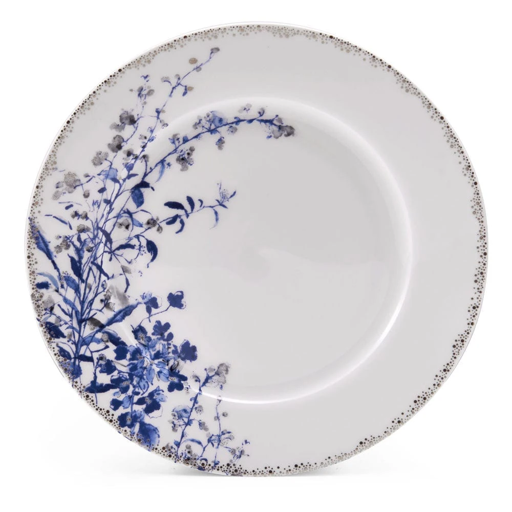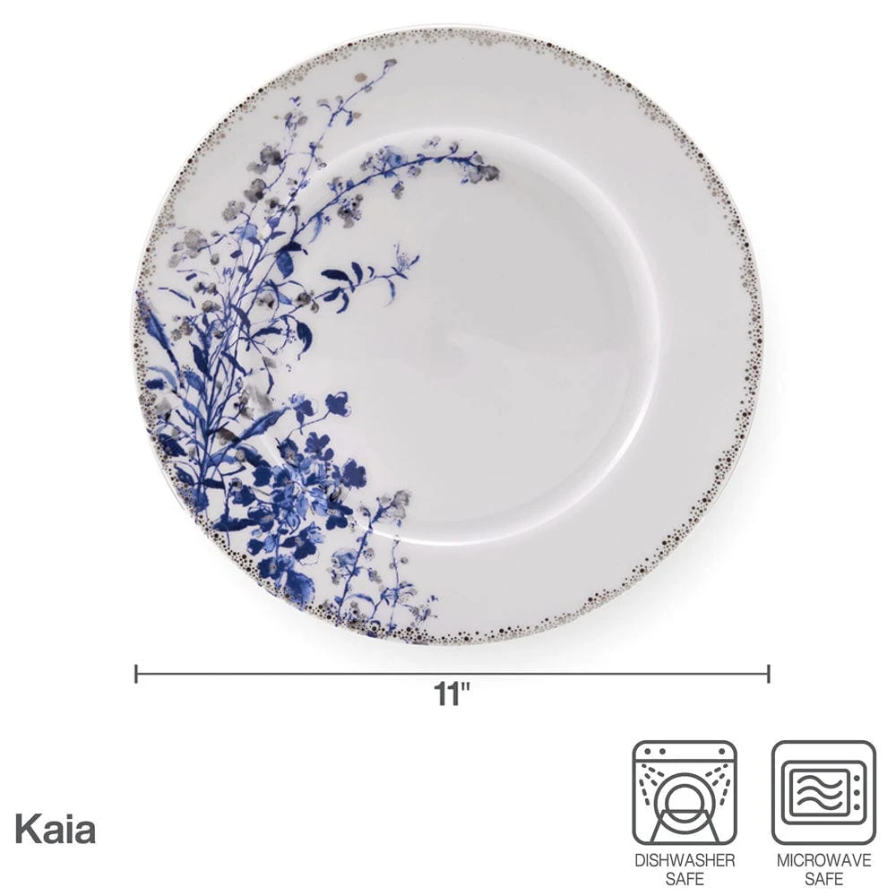 This Kaia Platinum Set of 4 Dinner Plates feature a crisp white background, adorned with a vibrant blue floral pattern climbing up the side of the plate, with a striking platinum dotted band that borders the rim, and will add a touch of elegance and sophistication to your table.