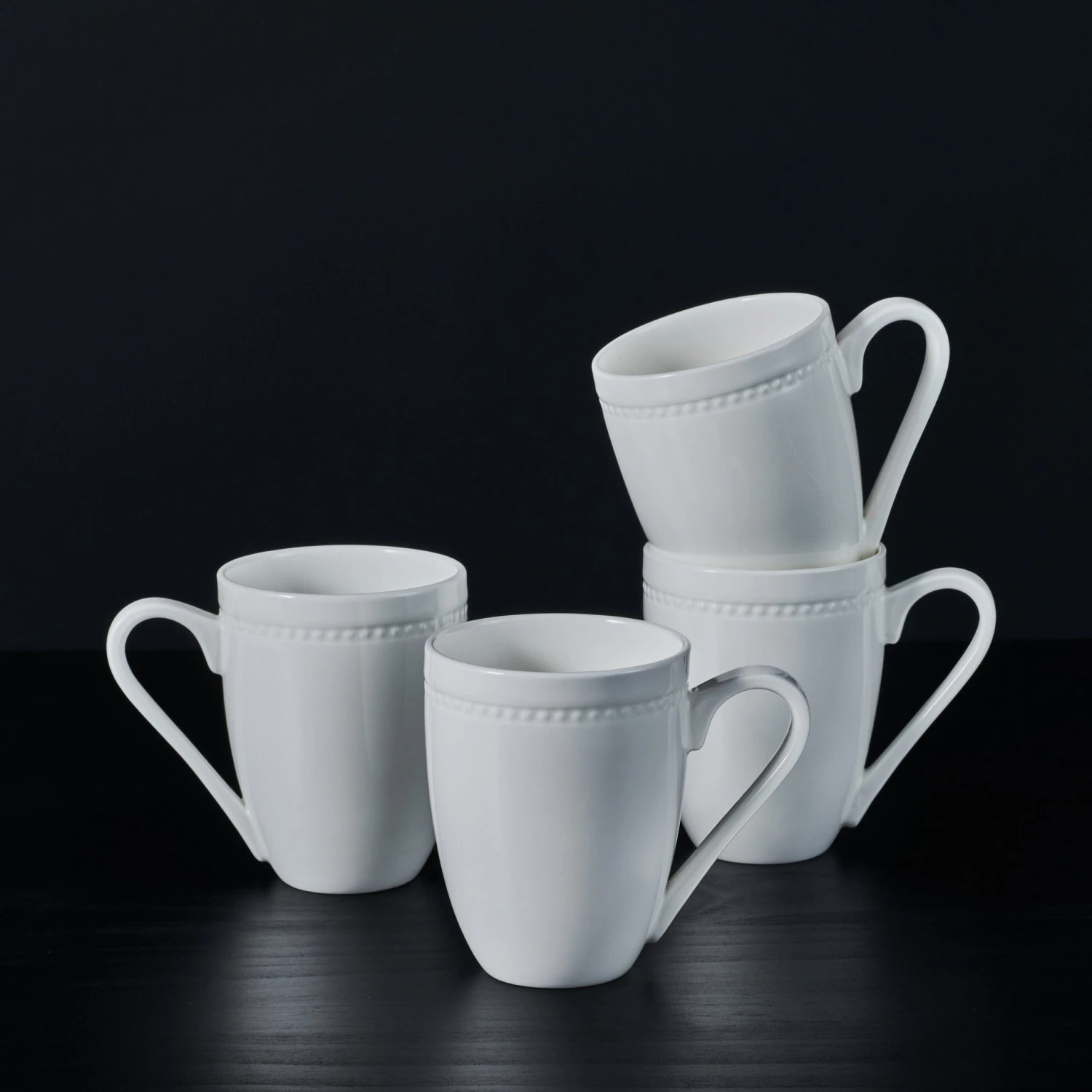 This Loria Set of 4 Mugs feature a pristine white background with a simplistic embossed bead design wrapping around the rim, and will add a touch of style to your table.