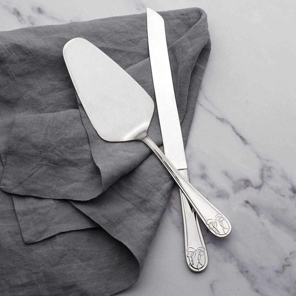 The Love Story Cake Knife and Server Set features a unique ribbon detail on the handle, the lasting brilliance and incredible shine will make the remarkably smooth flatware a staple.