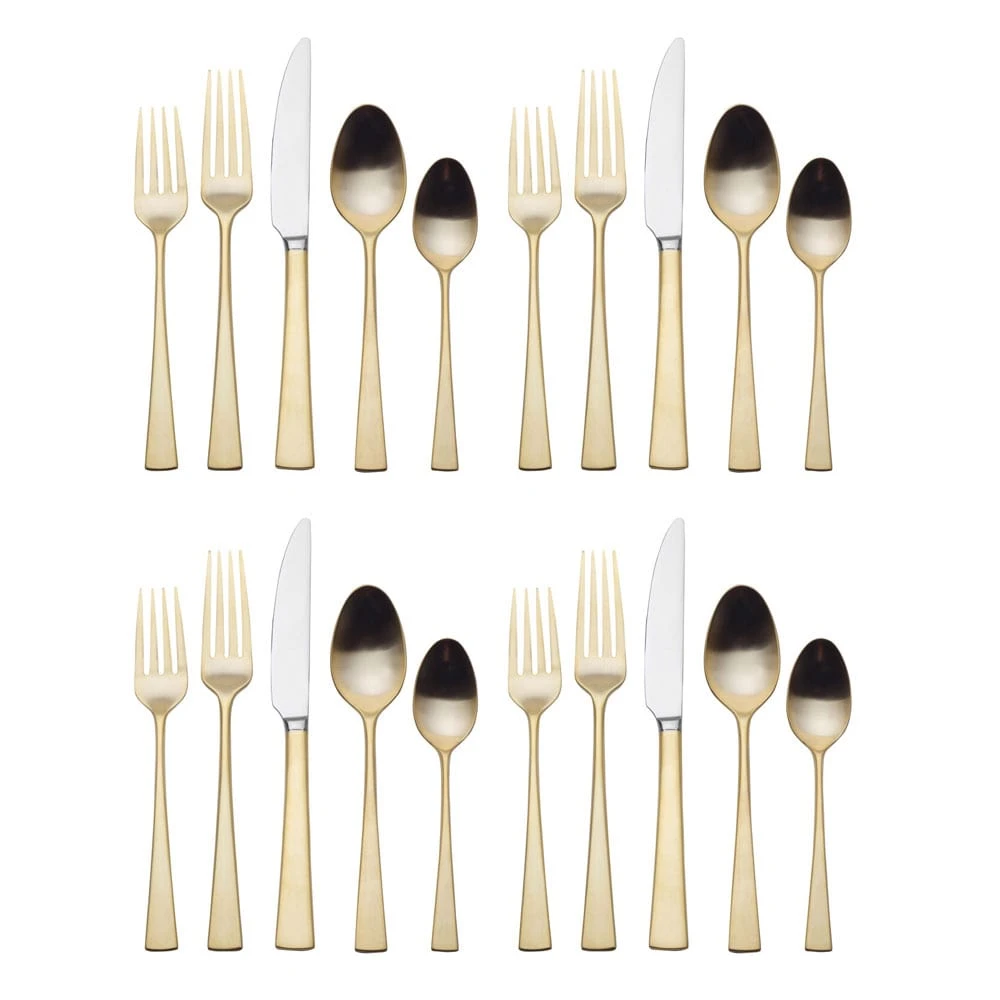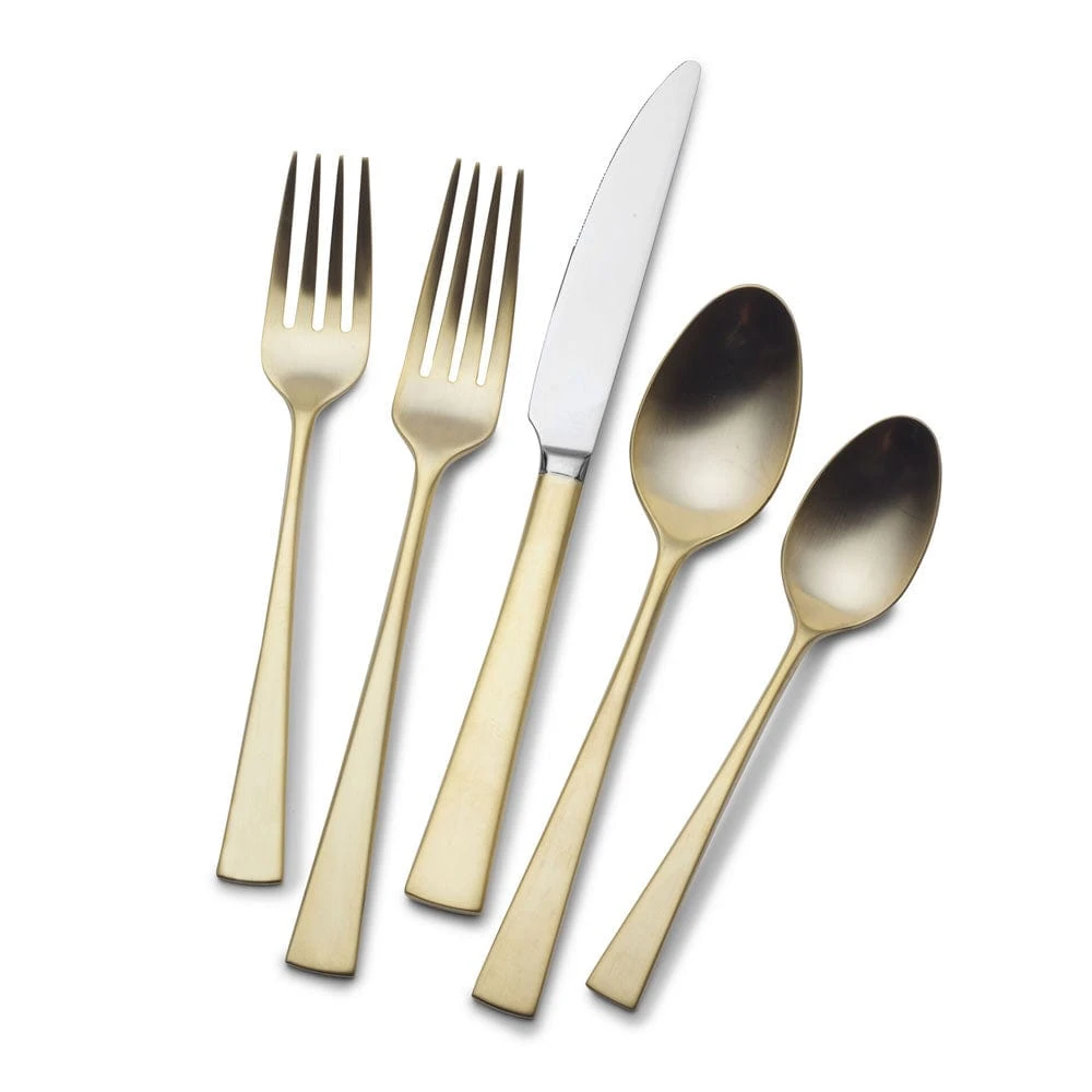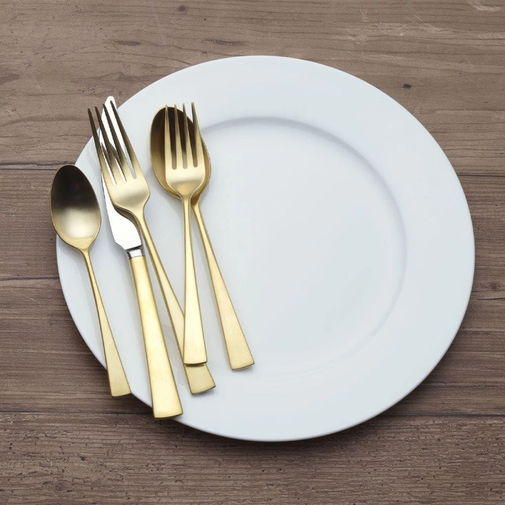 This Lucia Satin Gold Flatware Set boasts an ultra-modern design in a gently tapered block shape handle, and will add contemporary elegance to your table.
