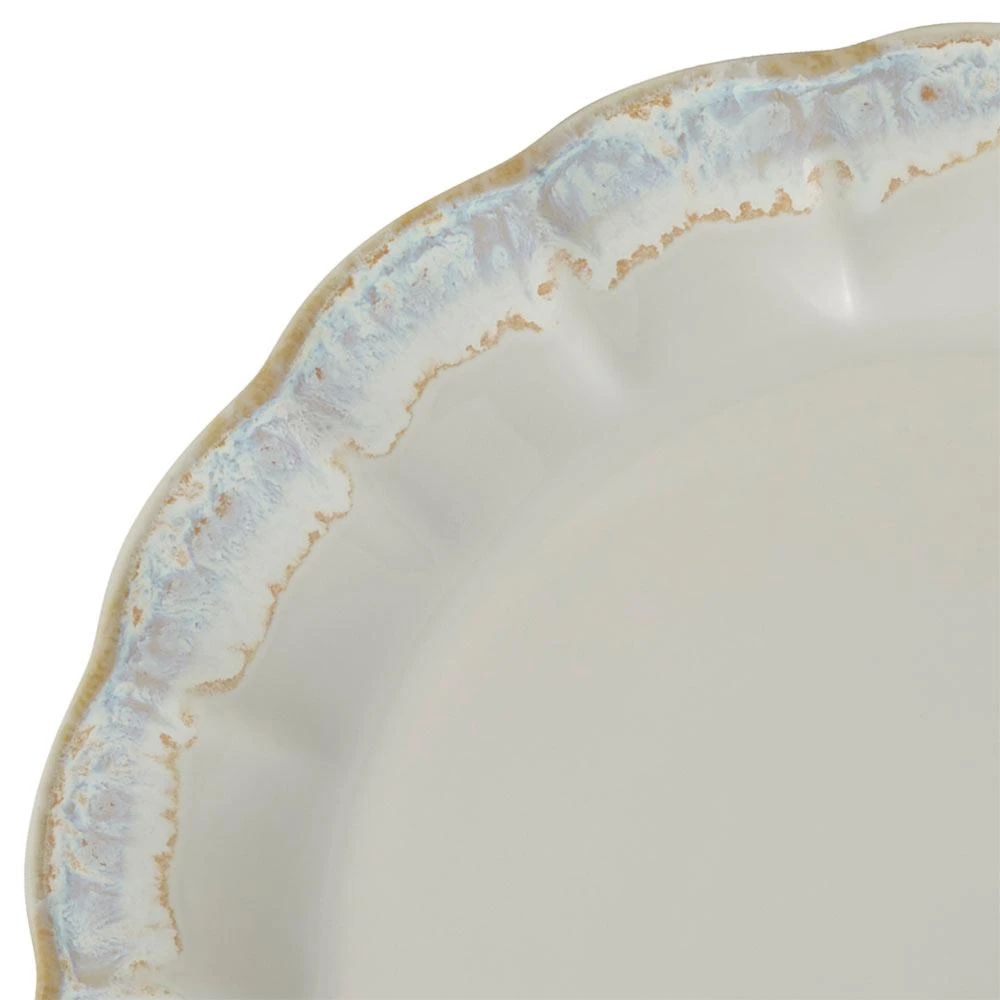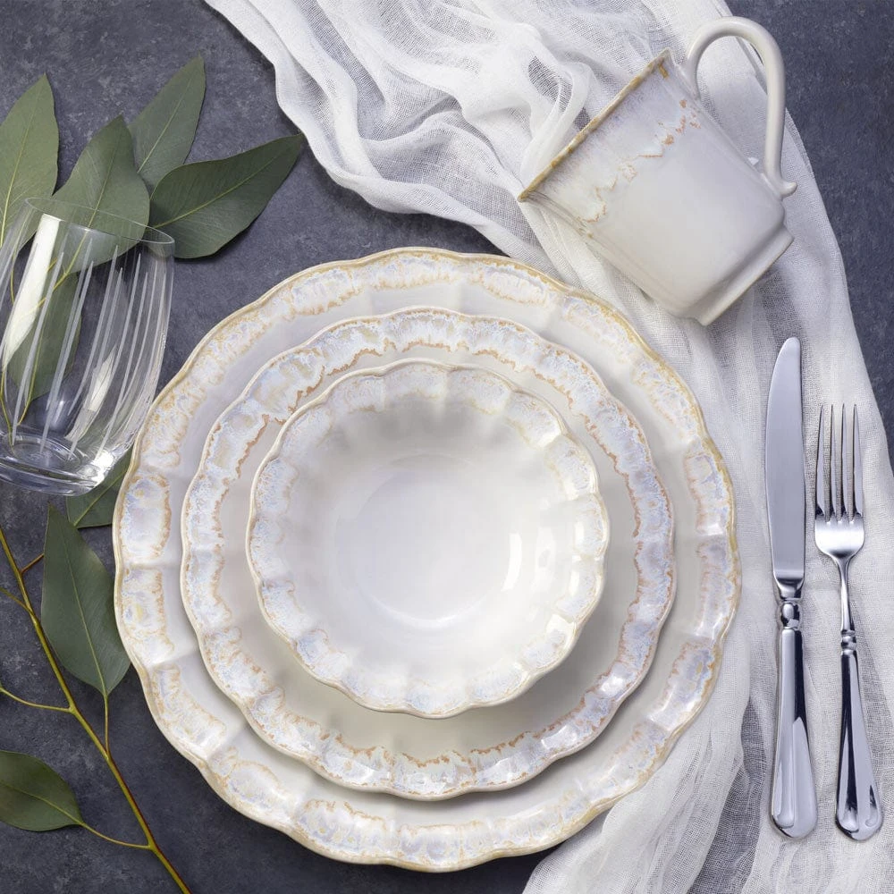 Mila gives classic dinnerware design a distinctly modern spin. The shapes and scalloped edges are reminiscent of traditional, elegant dinnerware, yet the rims have a subtle wash of blue and tan that add a contemporary, abstract accent. Crafted of high-quality stoneware. Microwave and dishwasher safe. 4 piece place setting includes an 11 inch dinner plate, 9 inch salad plate, 6 inch soup bowl, and 12 ounce mug.