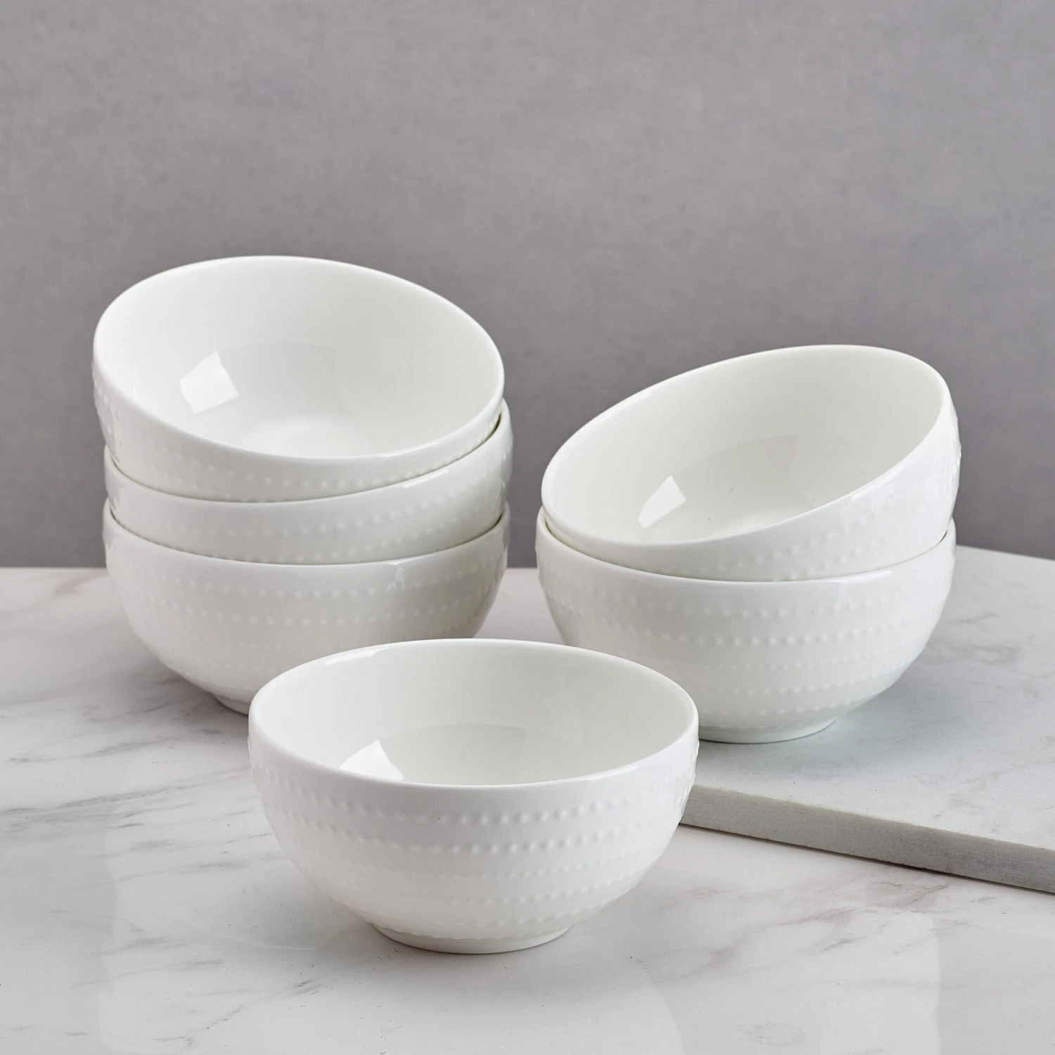This Nellie Set of 6 Fruit Bowls features exquisite embossed detail in a delicate embossed dot design, creating eye-catching depth and movement on your tabletop.