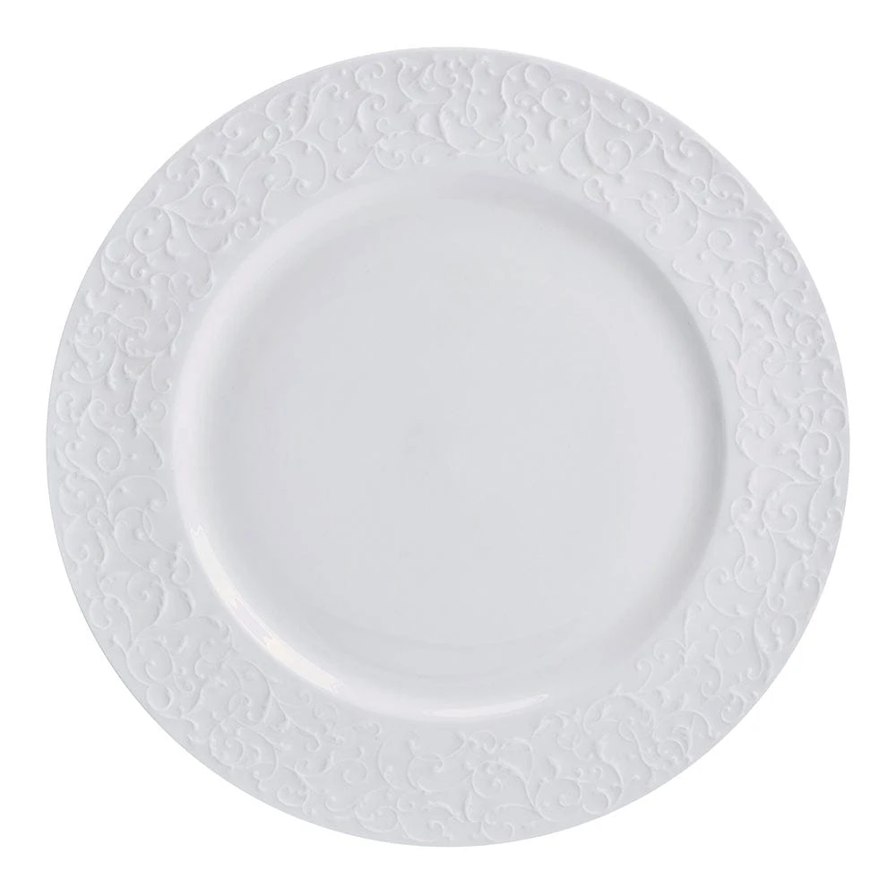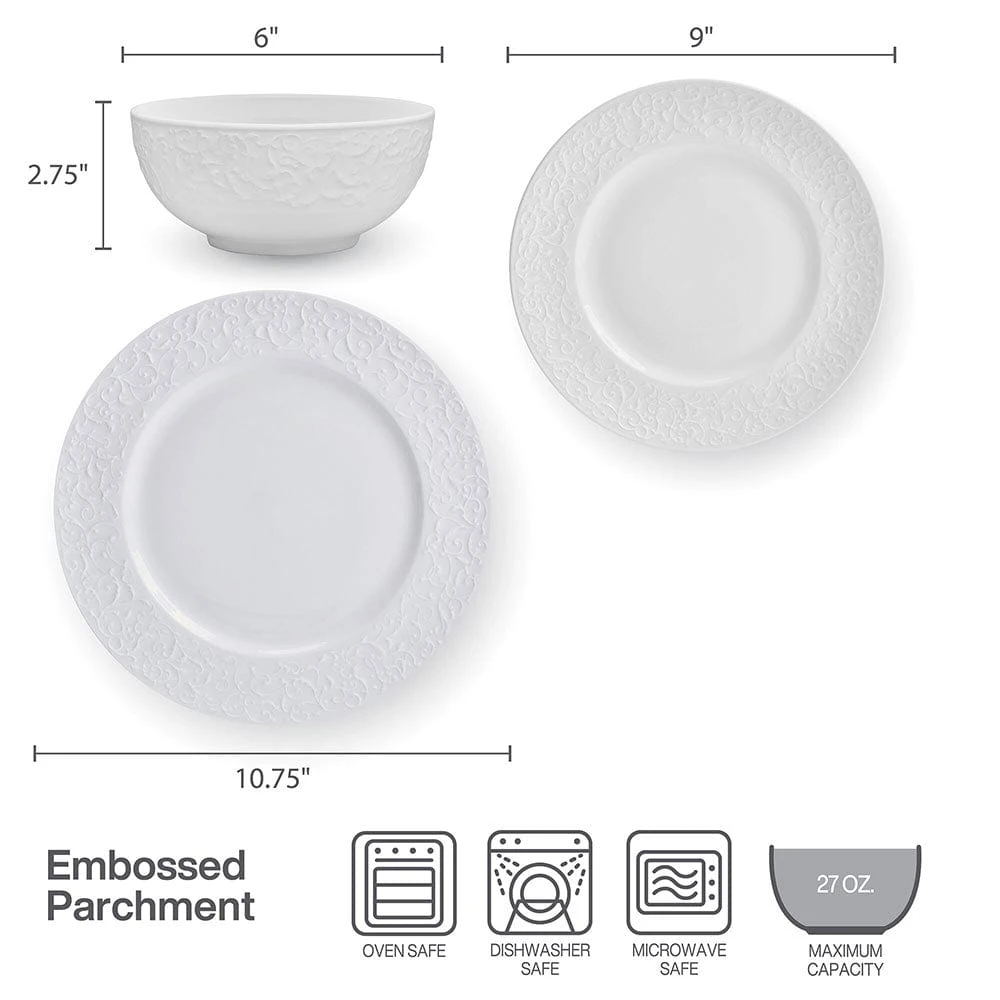 This Parchment White Dinnerware Set features a white body, with a distinctly different embossed scroll pattern encircling the rim of each piece, and the elegant design can be used for formal or casual entertaining.