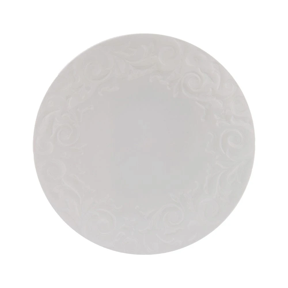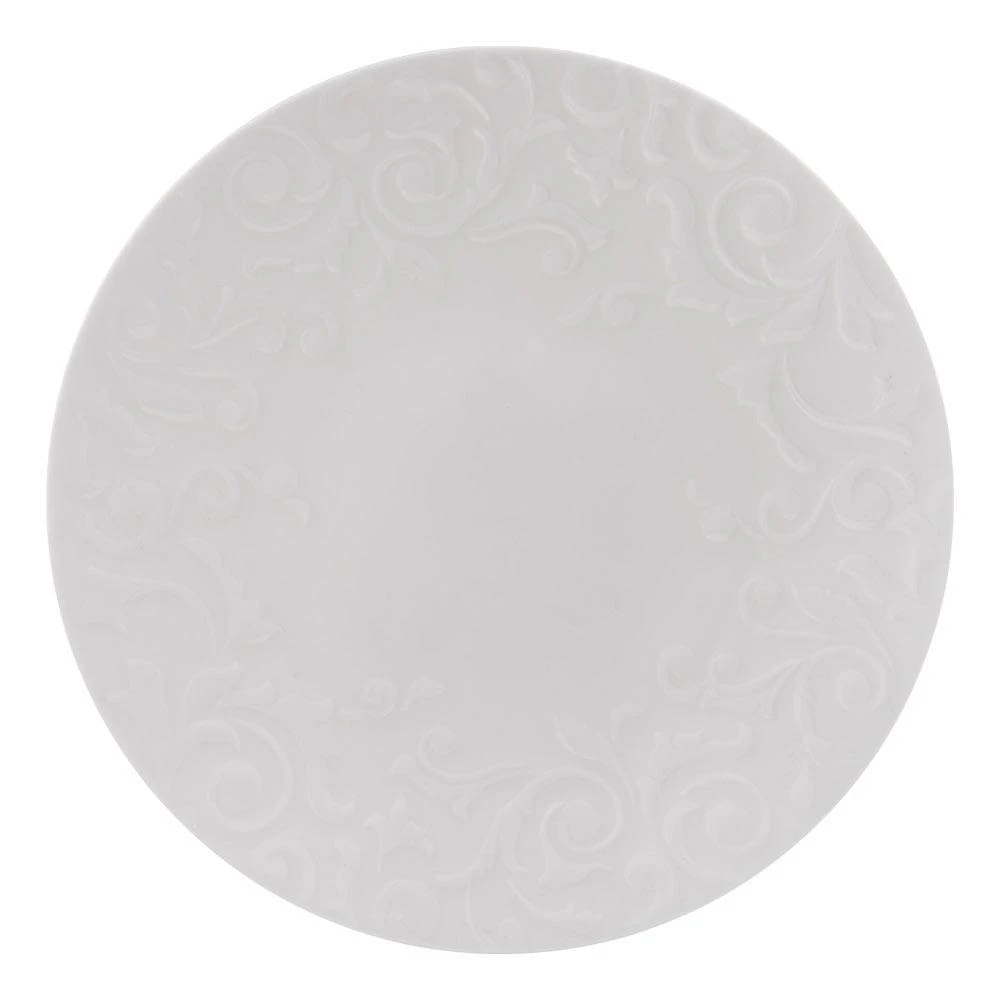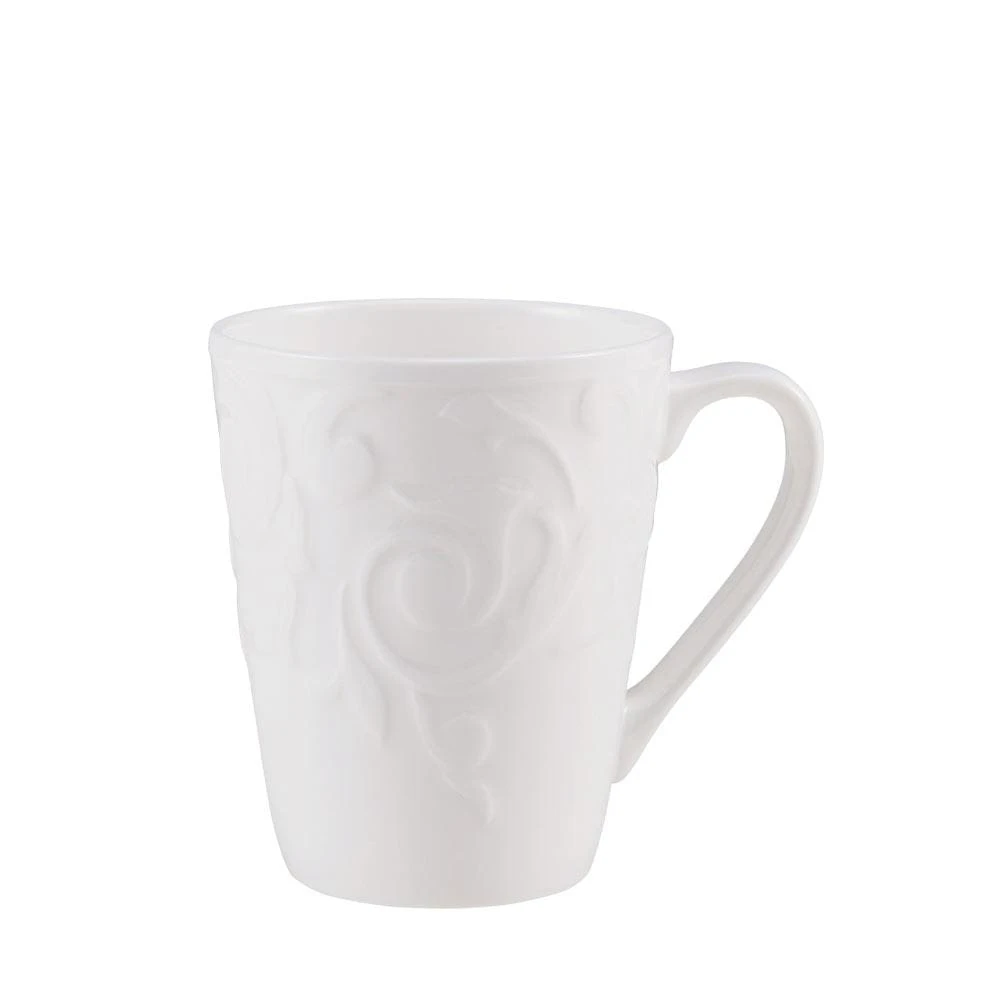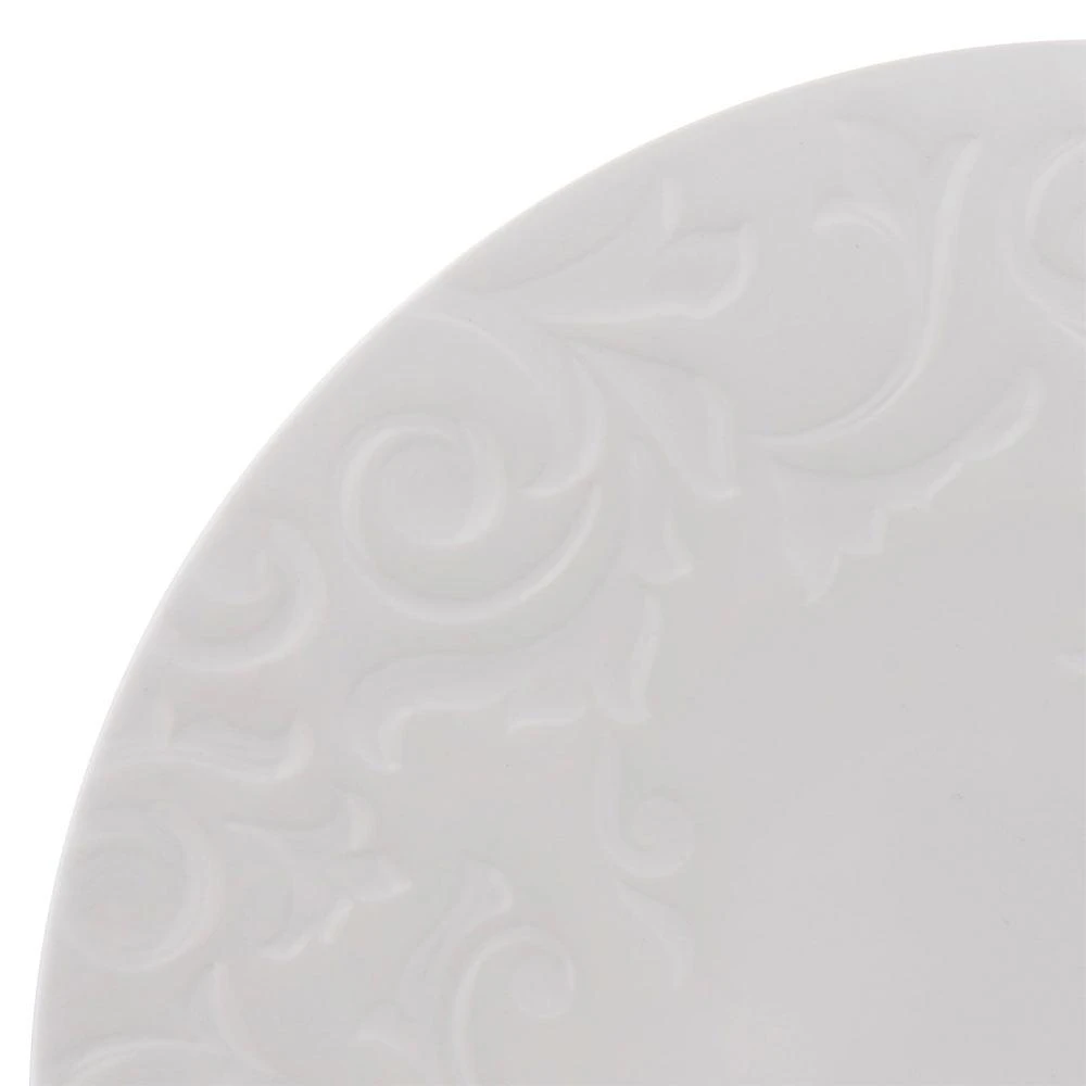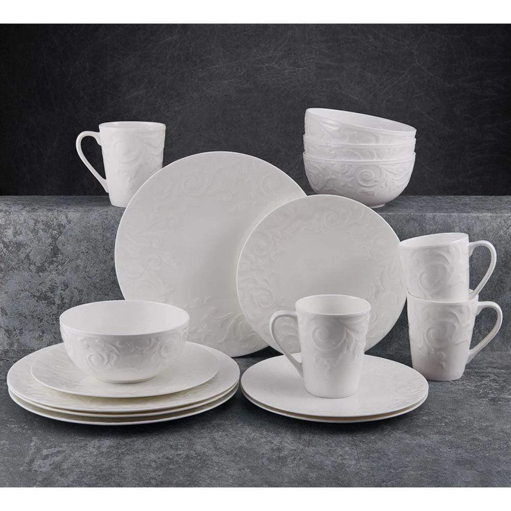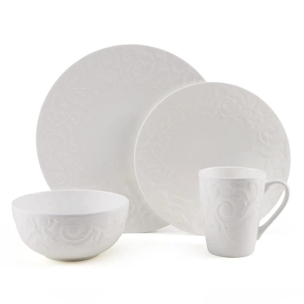 Mikasa Sadie dinnerware features an embossed scroll design around the rims, adding a flourish of interest to your place settings, and will complement any flatware of stemware. Crafted of bone china. 16 piece dinnerware set, service for four, includes (4) each: 10-3/4 inch dinner plate, 8-1/4 inch salad plate, 6 inch soup cereal bowl and 14 ounce mug. Microwave, dishwasher and oven safe.