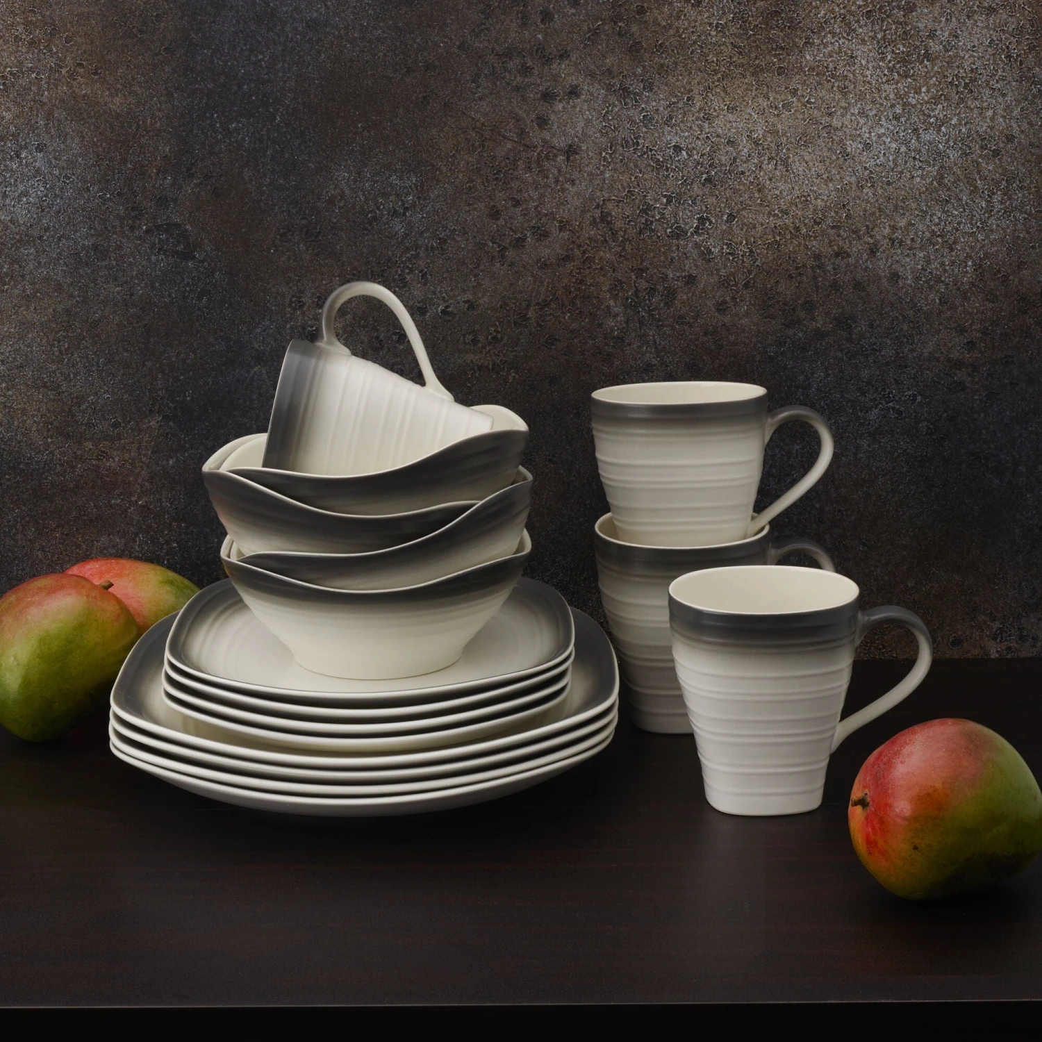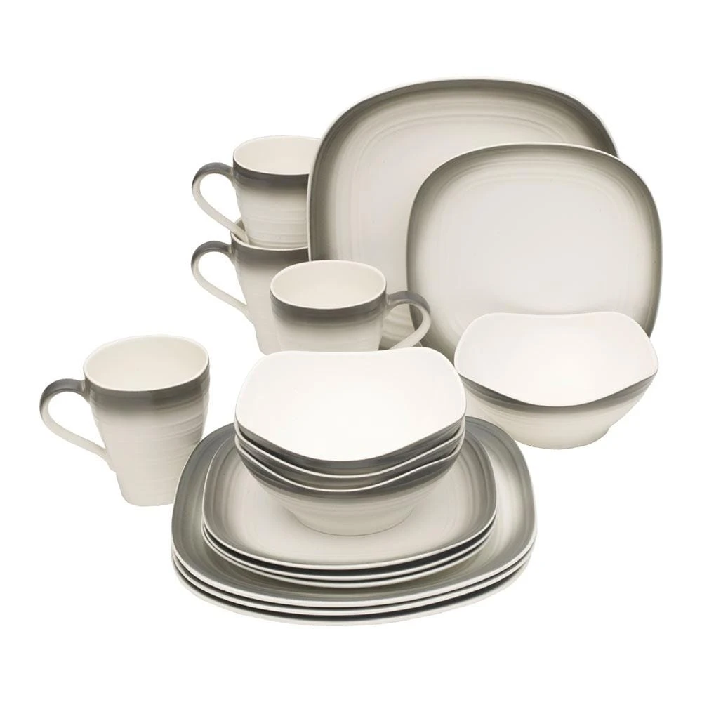 Swirl Ombre features clean lines in a rustic, earthy pattern with a matte and glossy finish, and beautifully graduated coloration, set a striking table setting. The soft rib on the outside of the collection offers a hand made look. Crafted of ironstone with a pin-firing technique which allows the entire bottom of the plate to be glazed, including the base. This process significantly reduces water absorption and increases chip resistance. 16 piece dinnerware set, service for four, includes (4) each: 11 inch square dinner plate, 8-1/2 inch square salad plate, 24 ounce square soup cereal bowl and 18 ounce square mug. Microwave and dishwasher safe.