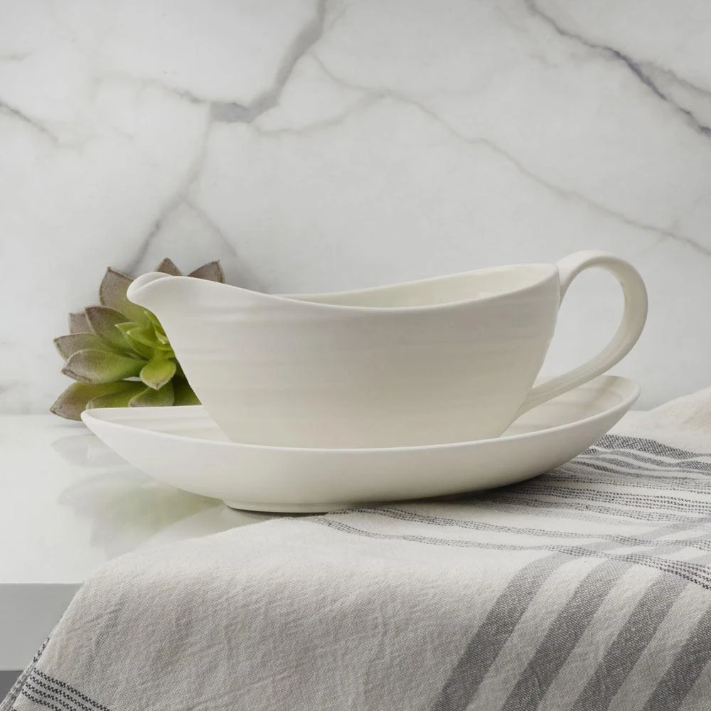 This Mikasa Swirl White Gravy Boat features a rich, double finish – smooth and glossy on the inside, ribbed and matte on the outside, with a pin-firing technique which allows the entire bottom of the plate to be glazed, including the base. This process significantly reduces water absorption and increases chip resistance.