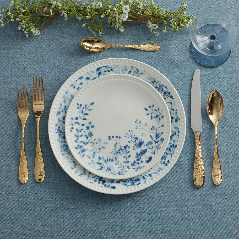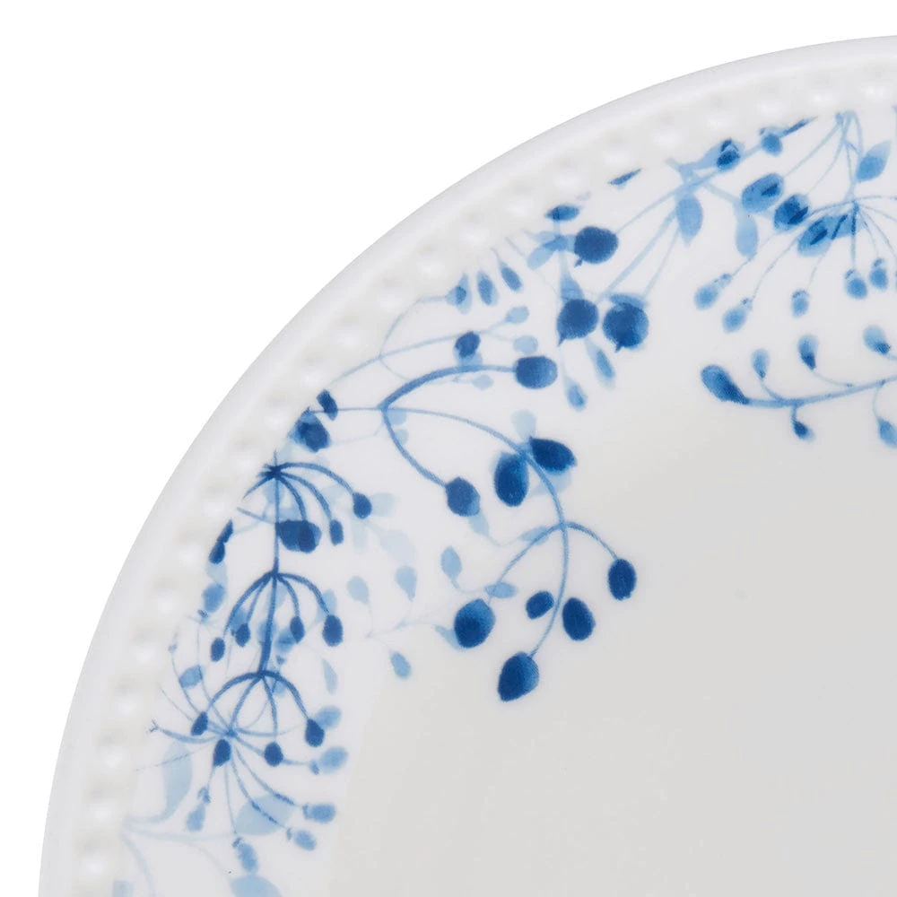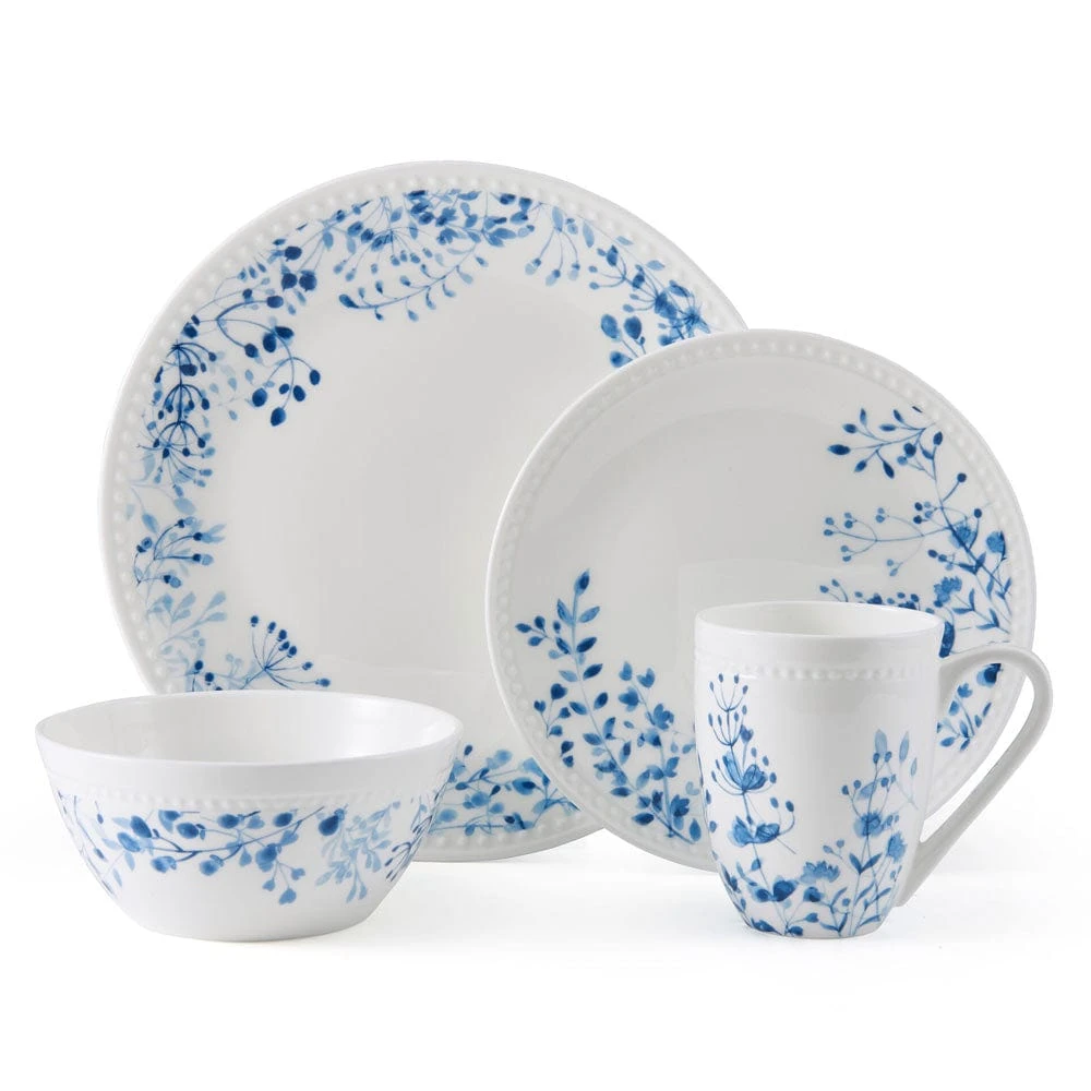 This Mikasa Taryn Dinnerware Set features clean white pieces, bordered by a delicate blue floral pattern and framed with a subtle beaded accent, inviting a touch of sophistication to dinner gatherings.