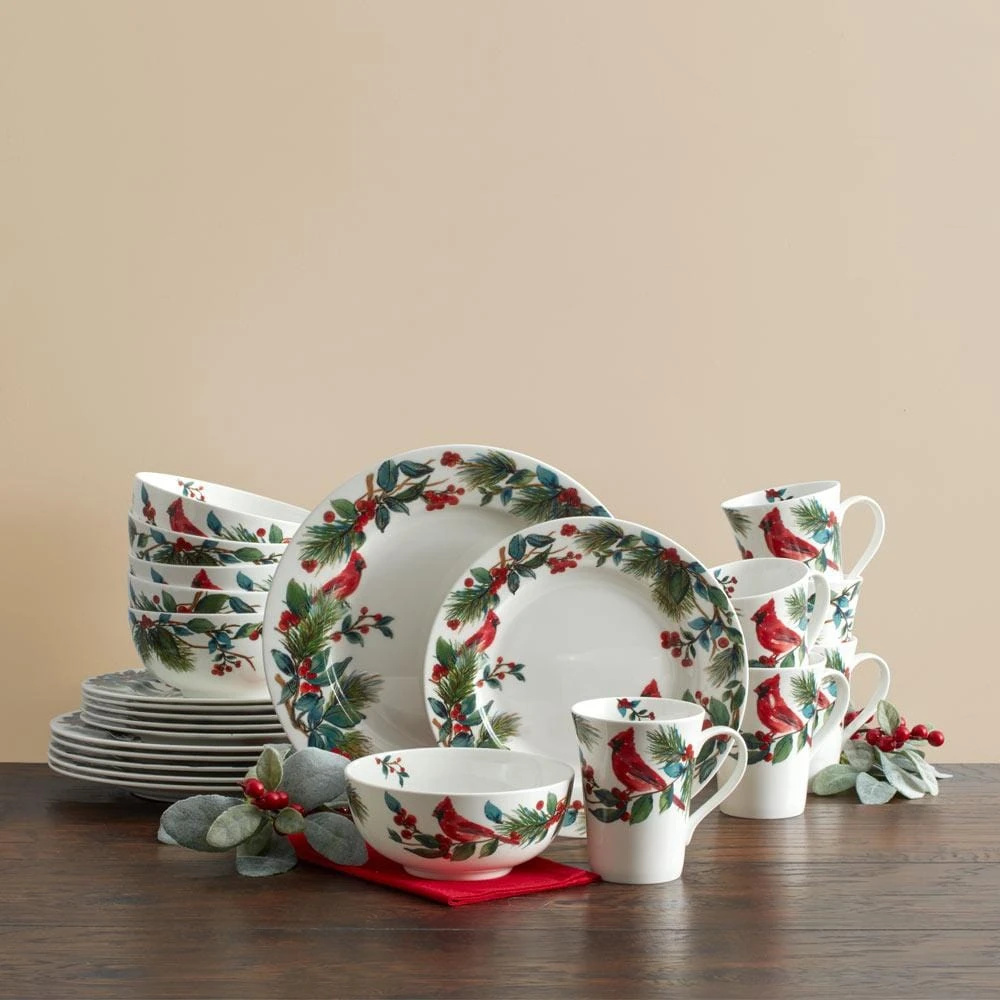This Mikasa Winter Cardinal Dinnerware Set features a beautiful watercolor poinsettia and cardinal design. Perfect for everyday use; can be dressed up or down for all your holiday gatherings.